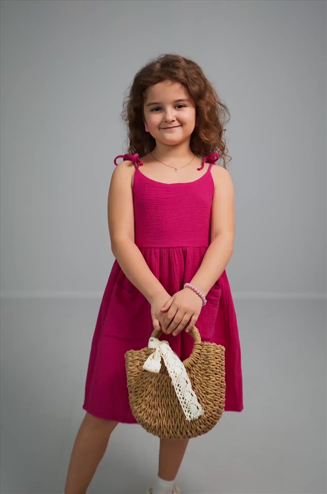 Милый короткий сарафан малинового цвета создан для активного лета. Лёгкий муслиновый сарафанчик для девочки станет настоящей находкой для повседневных приключений девочки, особенно если впереди — весёлый день в садике.