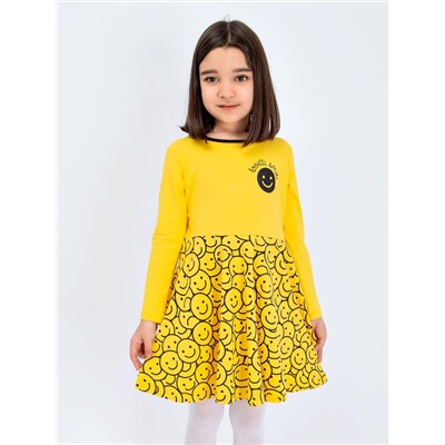Яркое, трикотажное платье с приталенным верхом и расклешенной юбкой. Модель декорирована принтом с изображением смайлов.
