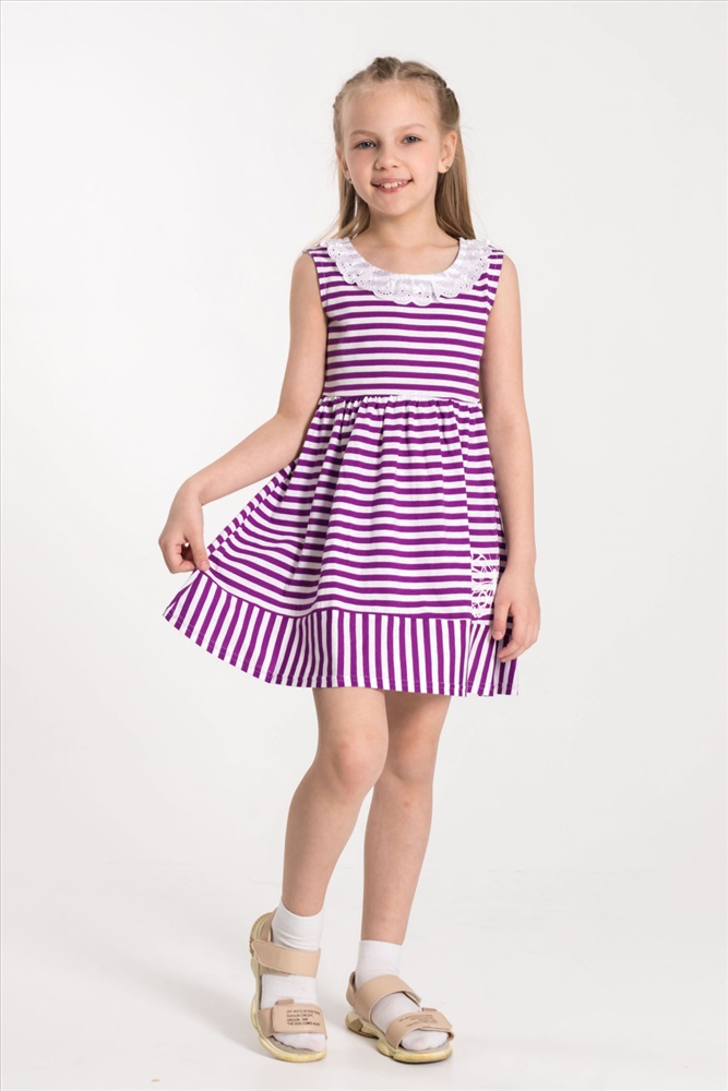 Платье из кулирки в мелкую полоску. Без рукавов, с отрезной юбкой на сборку. На спине застежка на кнопки. Горловина отделана кружевом. На юбке отделочная полоса и принт.