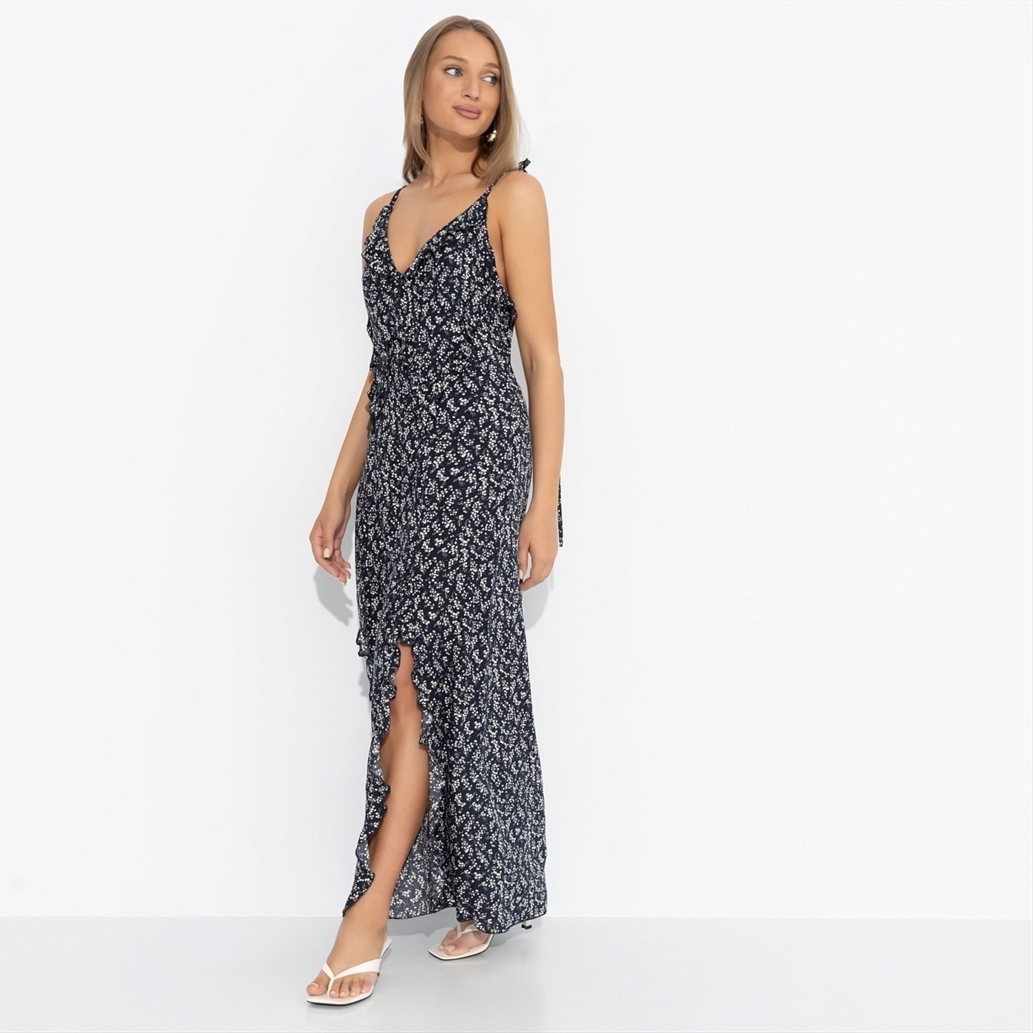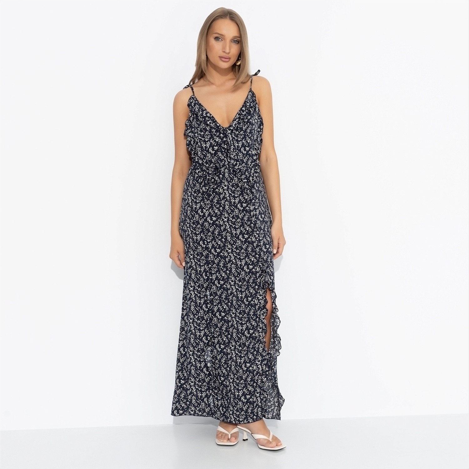 Рецепт идеального образа – это сарафан CHARUTTI в стиле бохо, приправленный щедрой щепоткой роскоши. Микс женственности, свободы и цветочного изящества создает чарующий, почти гипнотический эффект. Сарафан в длине макси на тонких бретелях. Бретели на тонких завязках. Изделие дополнено объемными рюшами. Есть глубокий разрез. Приталенный силуэт. Открытая спинка.