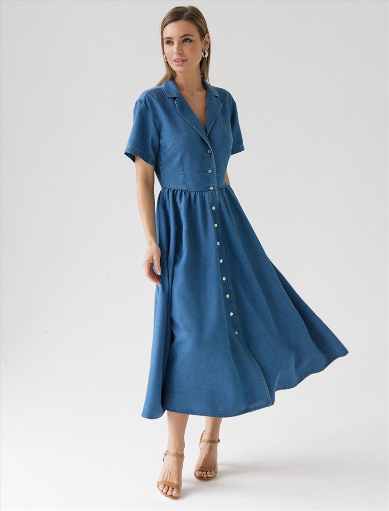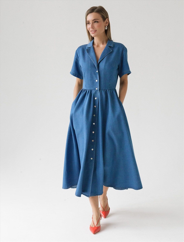 Состав: 60%Лиоцелл (Вис) 36%ПЭ 4%Вис Платье выполнено из лиоцелла. Модель с английским воротником и пышной юбкой полусолнце дополнена пуговицами из натурального перламутра и боковыми карманами. Ткань с характерным атласным блеском полностью имитирует обычный деним, но в тоже время намного более мягкая, плавно струится по телу, хорошо драпируется и охлаждает кожу в жаркое время года.