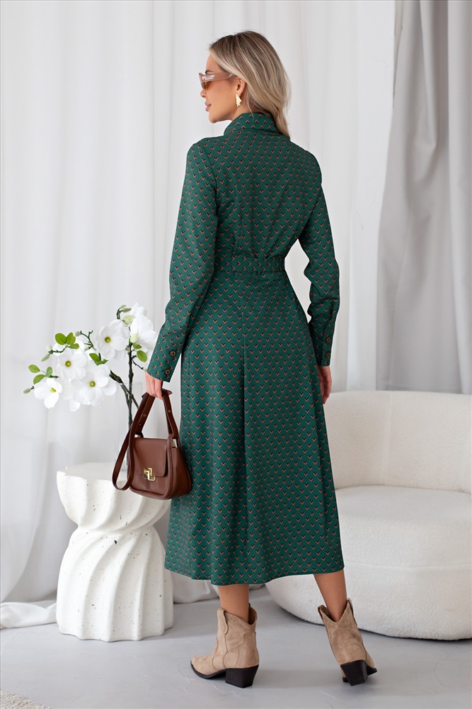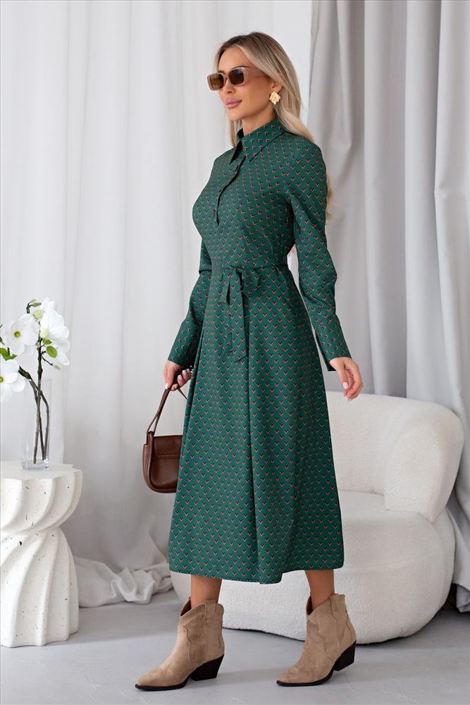 Женственное платье приталенного силуэта. Горловина оформлена отложным воротником на стойке. По переду втачная планка с застежкой на петли и пуговицы. Длинный втачной рукав оканчивается притачной манжетой. Модель отрезная по линии талии, с боку застежка на потайную молнию. Юбка дополнена встречными складками. Пояс из основной ткани в комплекте.