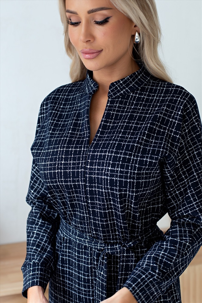Лаконичное платье прямого силуэта выполнено из трикотажного полотна. Длинный цельнокроеный рукав летучая мышь, оканчивается притачной манжетой. Горловина оформлена воротником - стойка. По переду застежка на потайную молнию. По боковым швам расположены функциональные карманы. Низ ровный, по бокам разрезы. Пояс из основного материала в комплекте.