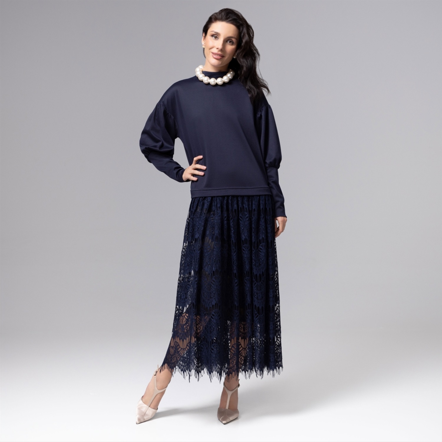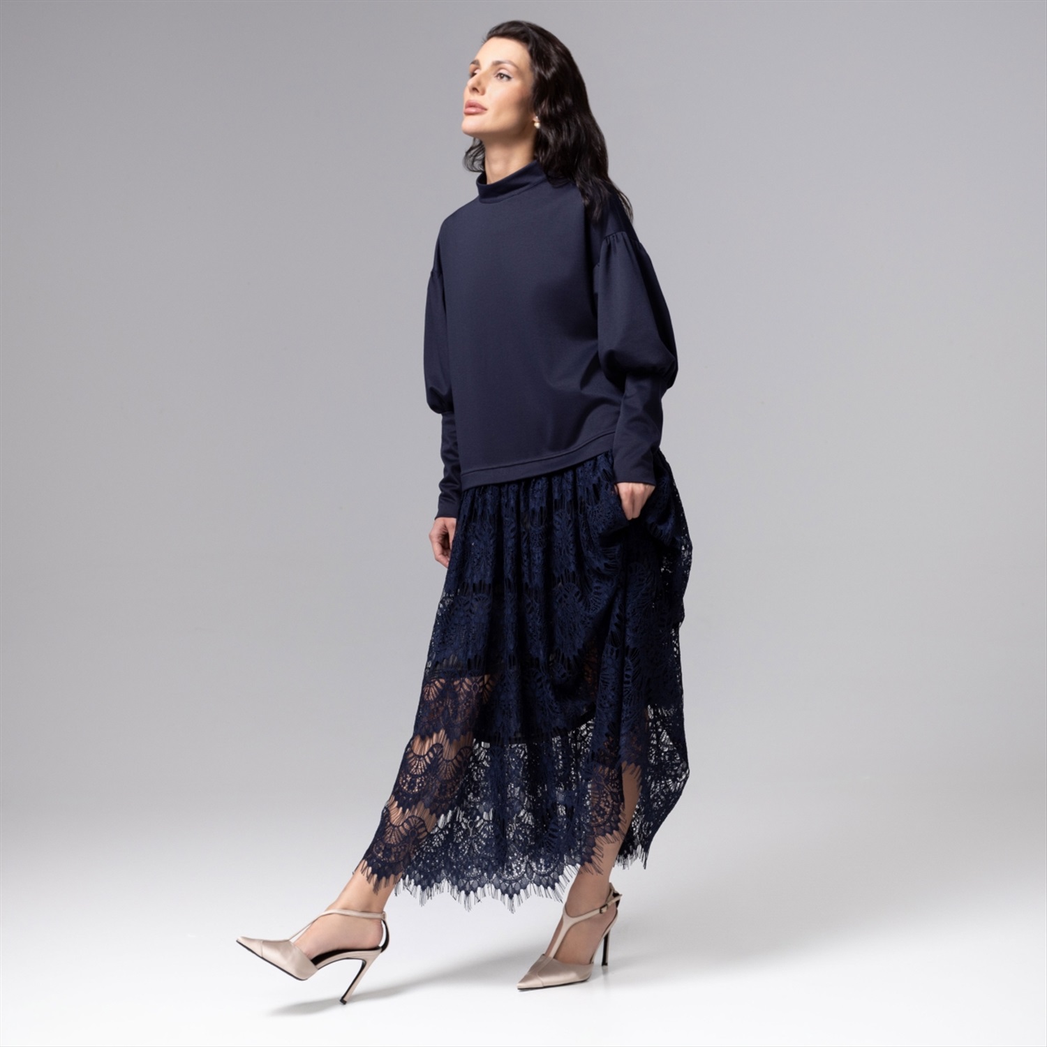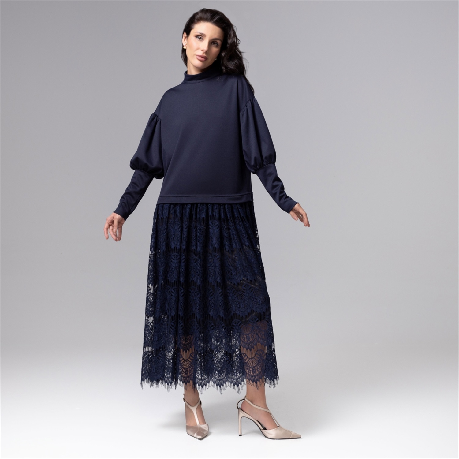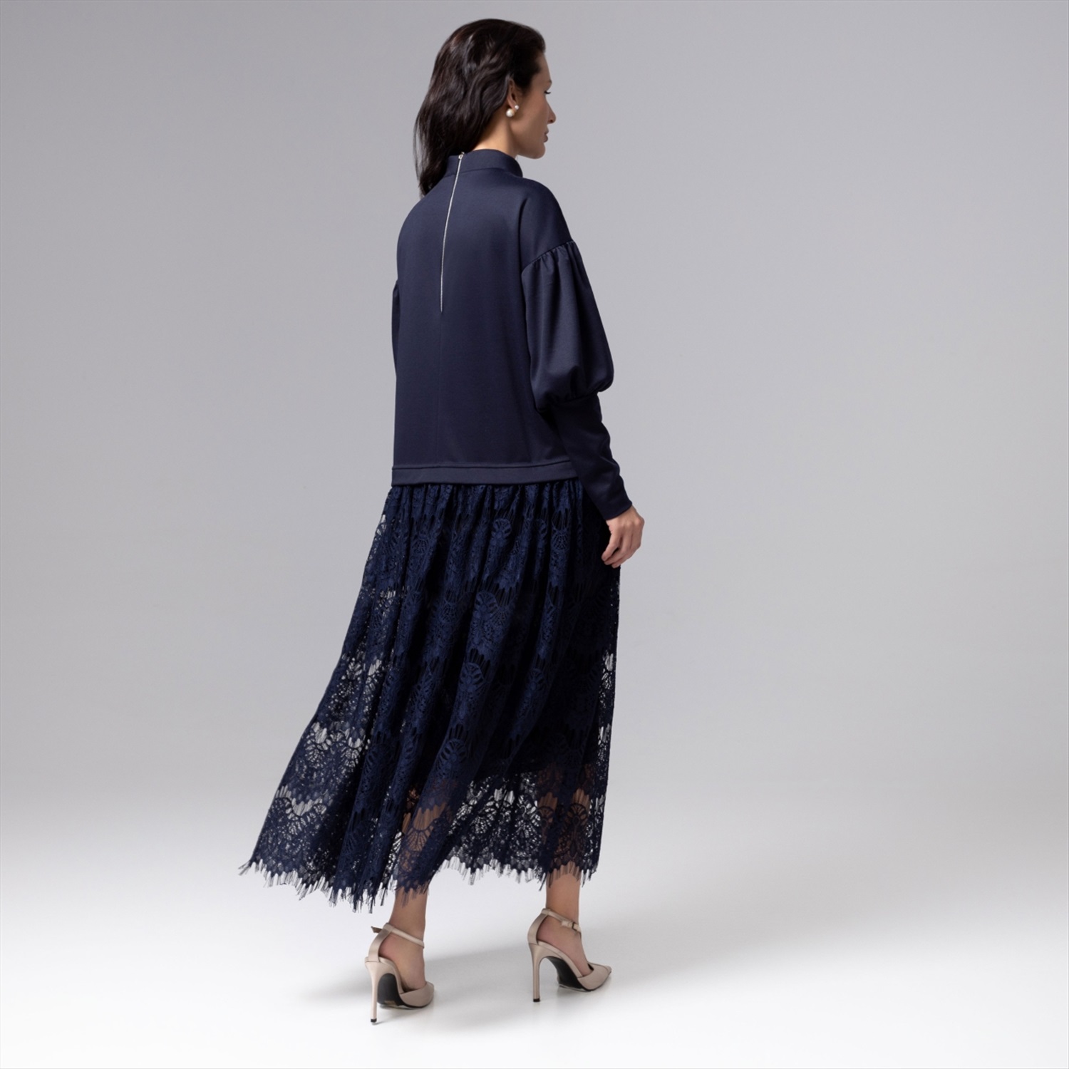 Платье ЧАРУТТИ в длине макси глубокого синего цвета выполнено из комбинации роскошного трикотажа и ажурного кружева. Изделие олицетворяет собой эталон высокой моды и безупречного вкуса. Безукоризненный пошив проявляется в виртуозной стыковке разнофактурных материалов. Воплощение современной элегантности. Модель оснащена мягким подкладом. Акцентный крой рукавов. Молния по спинке изделия.