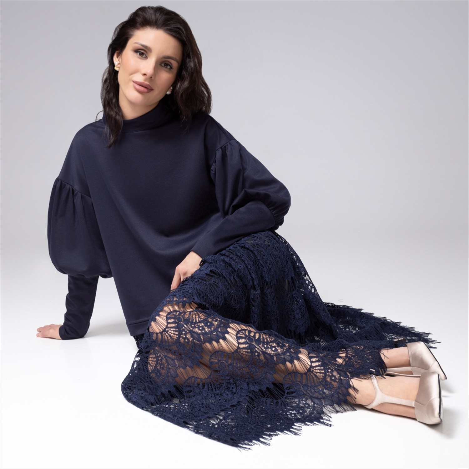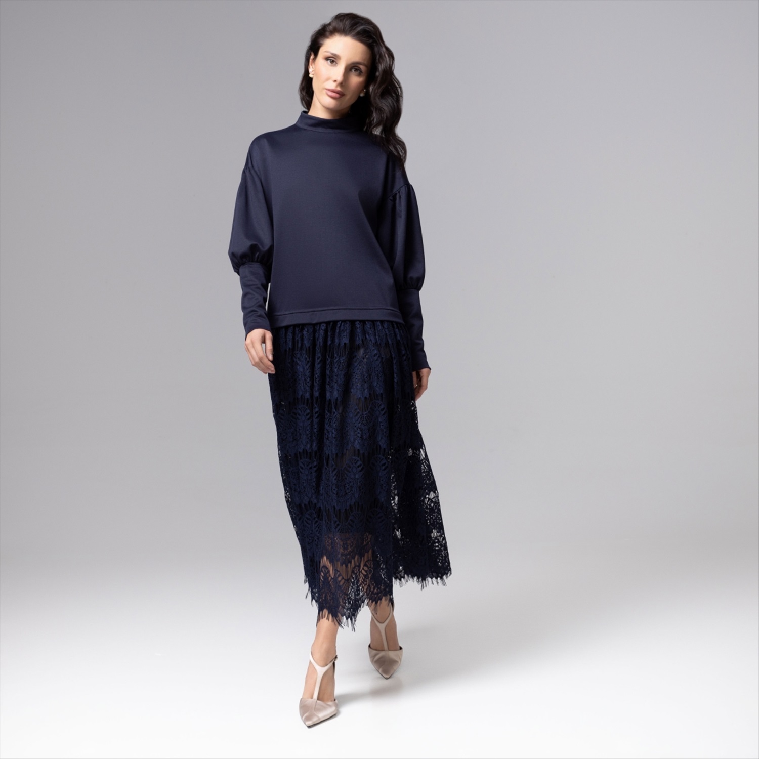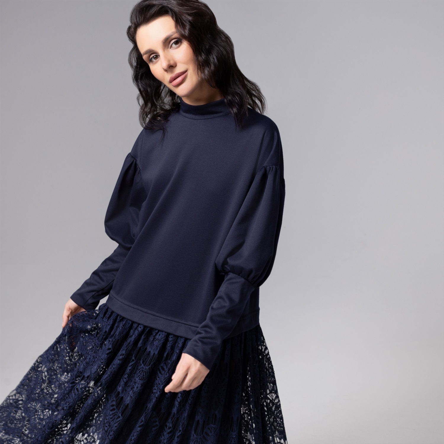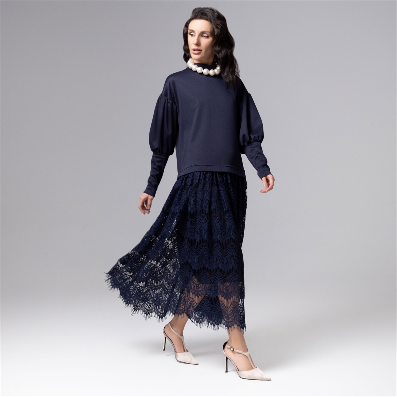 Платье ЧАРУТТИ в длине макси глубокого синего цвета выполнено из комбинации роскошного трикотажа и ажурного кружева. Изделие олицетворяет собой эталон высокой моды и безупречного вкуса. Безукоризненный пошив проявляется в виртуозной стыковке разнофактурных материалов. Воплощение современной элегантности. Модель оснащена мягким подкладом. Акцентный крой рукавов. Молния по спинке изделия.