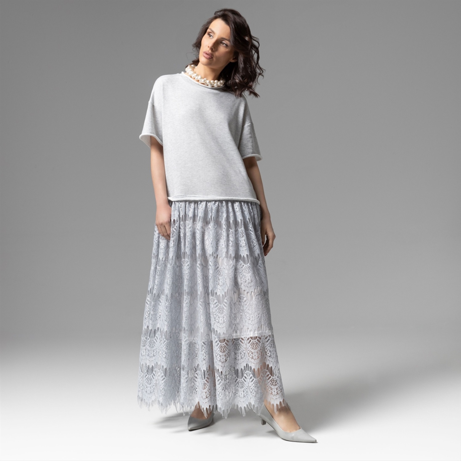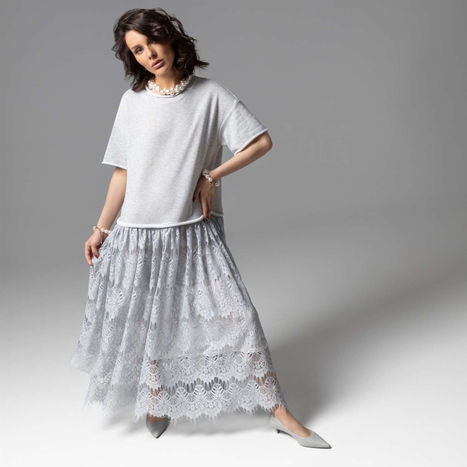 Состав: Трикотаж «футер», кружево, трикотаж подклад (65% полиэстер, 30% хлопок, 5% спандекс) Плотность ткани: Средняя Тип ткани: Трикотаж Вид застежки: Нет Дополнительный цвет ткани: Серый Карманы: Нет Основной цвет ткани: Серый Отрезная талия: Нет Подклад: Есть Резинка по талии: Нет Рисунок/раппорт: Нет, все изделия идентичны Сезон: Лето Силуэт: Свободный Стиль: Повседневный Параметры модели на фото: