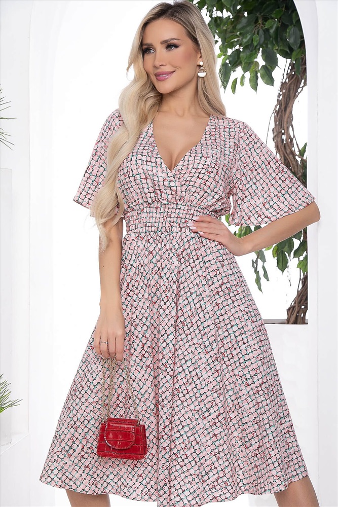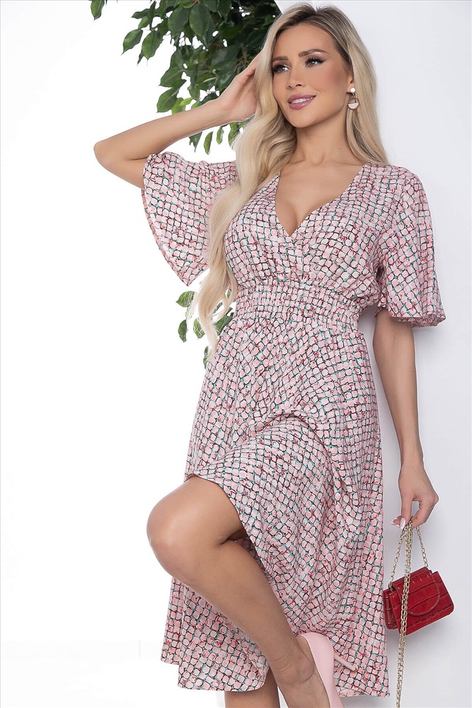 Платье женственного приталенного кроя средней длины. Благодаря гармоничным цветовым сочетаниям такая модель прекрасно впишется в ваш повседневный гардероб. Рукав скроен по типу " крылышко".