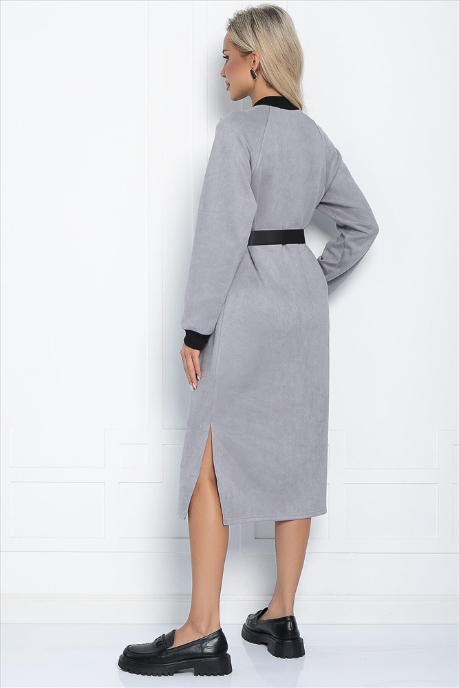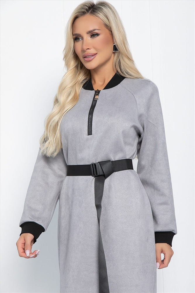 Стильное платье прямого силуэта невероятно приятое на ощупь. Рукав реглан оканчивается притачной манжетой. Воротник выполнен из эластичной трикотажной резинки - кашкорсе. По переду застёгивается на молнию. Низ ровный по бокам разрезы. При помощи пояса, входящего в комплект, можно подчеркнуть талию.