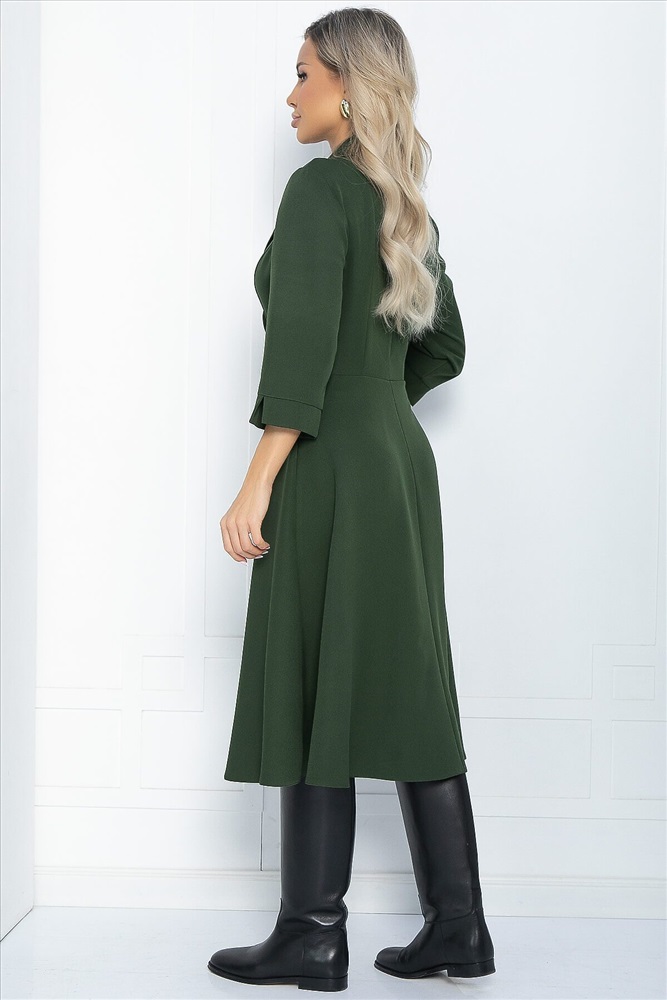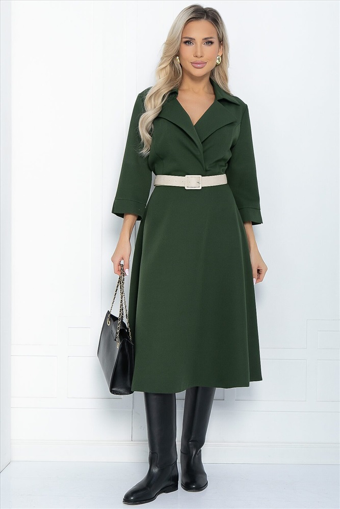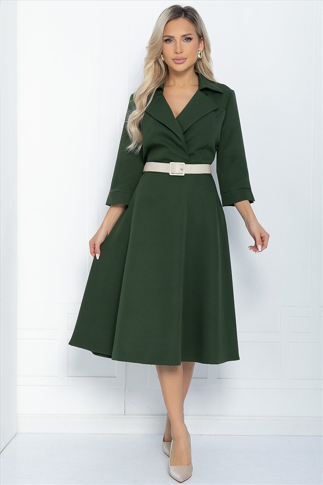 ID товара: 1065889 Состав: 65% Полиэстер, 30% Вискоза, 5% Эластан Сезон: Демисезон Длина: Ниже колена Фасон: Приталенное Рукав: 3/4 Вид застежки: Молния Вырез горловины: V-образный, отложной воротник Основная ткань: Полиэстер Стиль: классический Страна бренда: Россия Страна производства: Россия Артикул: П12093. Тип ткани: смесовая. Состав: 65% полиэстер, 30% вискоза, 5% эластан. Материал: костюмная. Цвет: хаки. Принт: отсутствует. Длина: миди. Вид застежки: потайная молния. Силуэт: приталенный. Карманы: отсутствуют. Подкладка: отсутствует. Декоративные элементы: отсутствуют. Длина по спинке от верхней точки плеча: 44-48/ 108 см, 50-54/ 110 см. Размер изделия на модели: 44. Рост модели: 168 см. Создайте безупречный деловой образ с элегантным платьем длиной миди. Это платье идеально подходит для офисных встреч и официальных мероприятий, сочетая стиль и комфорт. Приталенный силуэт подчеркивает фигуру, а расклешенная юбка добавляет изящества и динамичности. Рукава 3/4 с манжетами придают образу завершенность и стиль. Потайная молния в боку обеспечивает удобство и позволяет легко надевать платье. Воротник запах на стойке. В комплекте ремень. Уход за изделием: ручная стирка до 30 градусов; нельзя отбеливать; отжим запрещён; гладить при t не более 110 С; гладить с изнанки. Внимание! Рекомендуем ориентироваться на размерную сетку и выбирать свой привычный размер, согласно размерной таблице. *Допуск отклонения длины при массовом производстве 1-3 см является нормой. Комментарии к товару