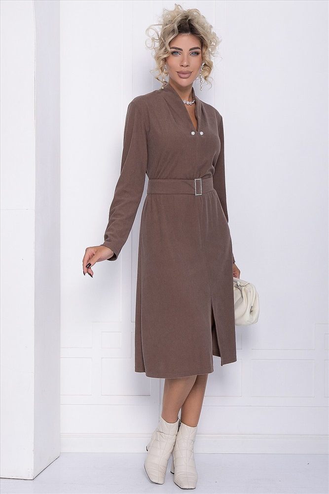 Артикул: П12108. Тип ткани: смесовая. Состав: 65% полиэстер, 30% вискоза, 5% эластан. Материал: трикотаж с текстурой вельвета. Цвет: кофейный. Принт: отсутствует. Длина: миди. Вид застежки: без застёжки. Силуэт: полуприлегающий. Карманы: отсутствуют. Подкладка: отсутствует. Декоративные элементы: пряжка и брошь. Длина по спинке от верхней точки плеча: 46-48/ 107 см, 50-52/ 108 см, 54-56/ 109 см. Размер изделия на модели: 44 Рост модели: 170 см.