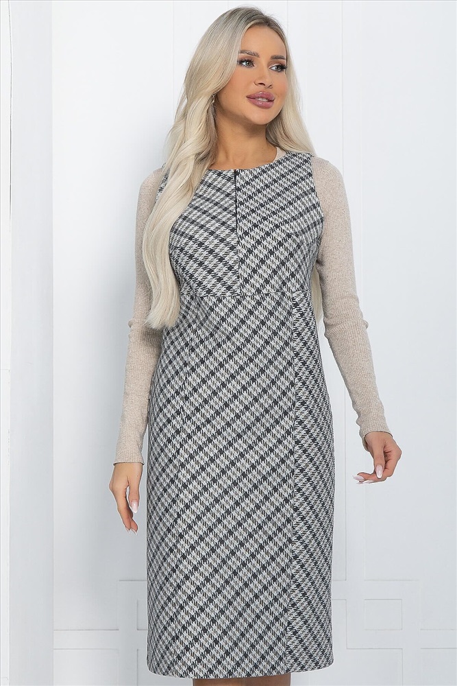 ID товара: 1069343 Состав: 80% Полиэстер, 17% Вискоза, 3% Спандекс Сезон: Демисезон Длина: прикрывает колено Фасон: Полуприлегающий Рукав: без рукавов Вид застежки: Молния Вырез горловины: Округлый Рисунок: Клетка Декоративные элементы: Принт Основная ткань: Полиэстер Стиль: классический Страна бренда: Россия Страна производства: Россия Артикул: П12205-25. Тип ткани: смесовая. Состав: 80% полиэстер, 17% вискоза, 3% спандекс. Материал: трикотаж. Цвет: серый. Принт: полоски и клетки. Длина: миди. Вид застежки: молния. Силуэт: полуприлегающий. Карманы: отсутствуют. Подкладка: отсутствует. Декоративные элементы: отсутствуют. Длина по спинке от верхней точки плеча: 44/ 101 см, 46-48/ 102 см, 50-52/ 104 см. Размер изделия на модели: 44 Рост модели: 168 см. Классический теплый сарафан является самым популярным вариантом для офисного, повседневного и делового стиля. Он сделает любой ваш образ ярким и запоминающимся. Спереди на груди молния, снизу сзади есть разрез. Отлично в сочетании с лонгсливом, водолазкой или блузой с пышными рукавами. Уход за изделием: ручная стирка до 30 градусов; нельзя отбеливать; отжим запрещён; гладить при t не более 110 С; гладить с изнанки. Внимание! Рекомендуем ориентироваться на размерную сетку и выбирать свой привычный размер, согласно размерной таблице. *Допуск отклонения длины при массовом производстве 1-3 см является нормой. Комментарии к товару