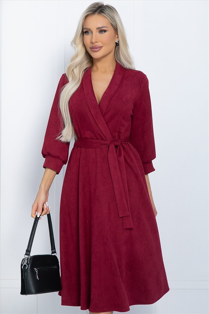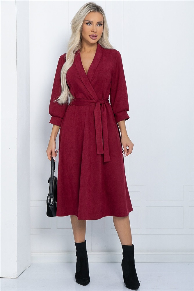 Платье из трикотажа с эффектом замши — идеальный выбор для тех, кто хочет выглядеть элегантно и стильно. Посадка изделия безупречна, она подчеркивает достоинства фигуры и скрывает недостатки. Верхняя часть платья выполнена на запах, а в комплекте идёт пояс из той же ткани, что и само платье. Талия отрезная.