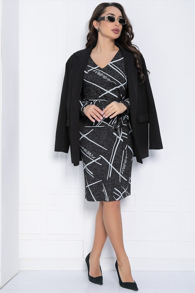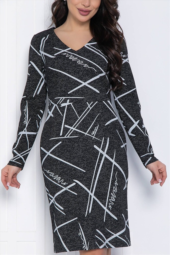 Артикул: П12499. Тип ткани: смесовая. Состав: 80% полиэстер, 20% эластан. Материал: трикотаж. Цвет: чёрно-серый. Принт: абстракция. Длина: миди. Вид застежки: без застёжки. Силуэт: полуприлегающий. Карманы: отсутствуют. Подкладка: отсутствует. Декоративные элементы: отсутствуют. Длина по спинке от верхней точки плеча: 44-50/ 99 см, 52/ 101 см.