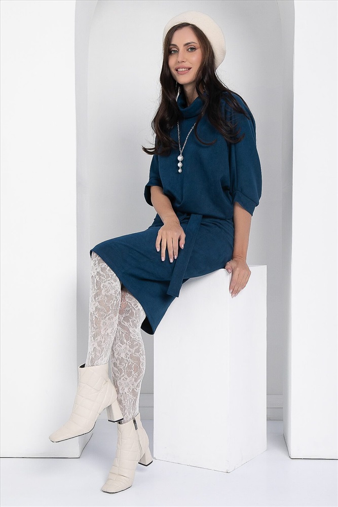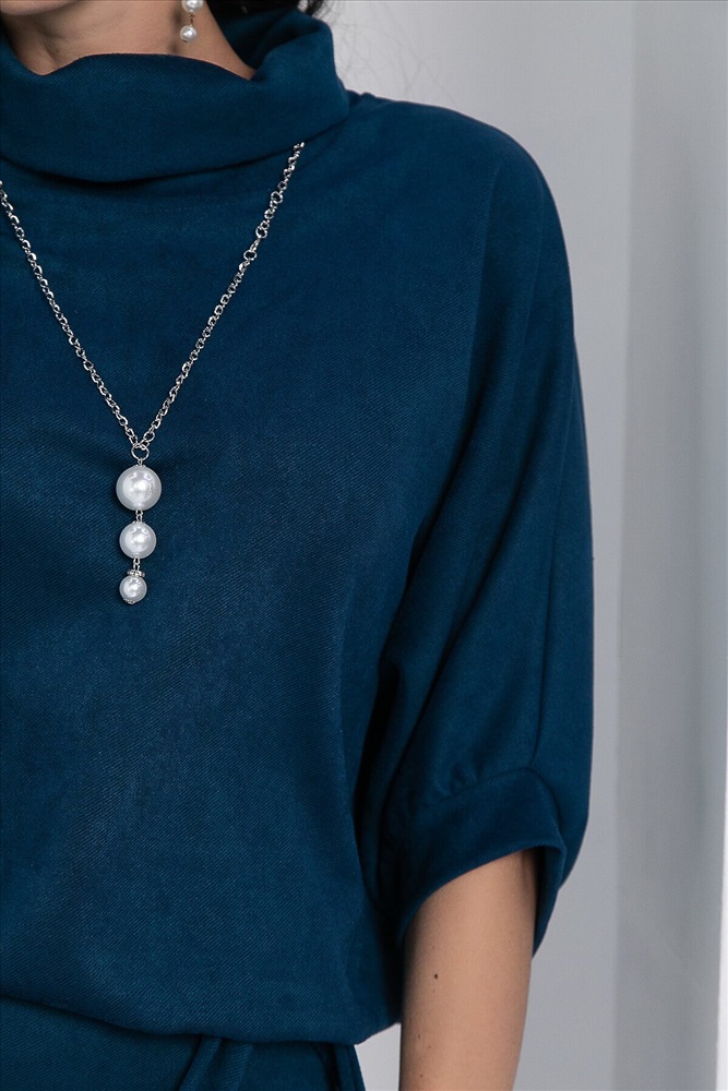 Платье из трикотажа в красивом сапфировом оттенке. Элегантная юбка, прилегающего силуэта, подчеркнёт красоту женской фигуры и визуально вытянет силуэт, а верх скроенный по типу «летучая мышь» не будет сковывать движений. Платье прекрасно подойдёт в качестве повседневного варианта и будет хорошо сочетаться как с туфлями или ботильонами, так и с кроссовками или ботинками. Благодаря своему фасону платье прекрасно справляется с задачей скрыть небольшие недостатки фигуры и подчеркнуть достоинства. Пояс из основной ткани и подвеска входят в комплект.