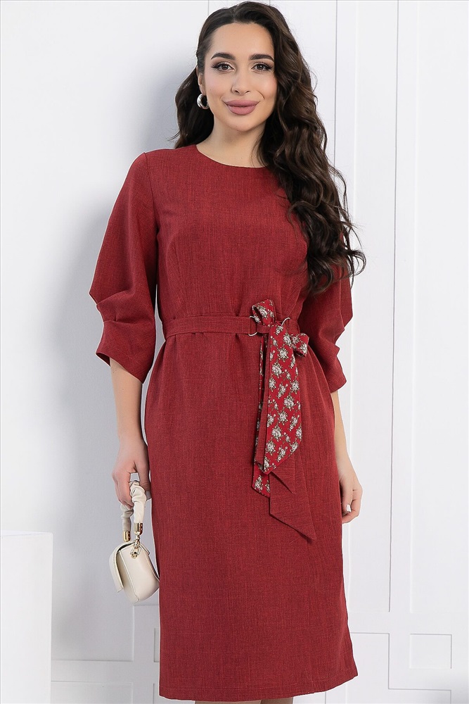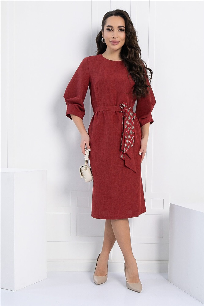 Артикул: П12888-36М. Тип ткани: синтетический. Состав: 100% полиэстер. Материал: костюмный "Габардин". Цвет: вишневый. Принт: отсутствует. Длина: миди. Вид застежки: молния на спинке. Силуэт: полуприлегающий. Карманы: отсутствуют. Подкладка: отсутствует. Декоративные элементы: пояс из основной ткани и дополнительный пояс из шифона в комплекте. Длина по спинке от верхней точки плеча: 44-46/ 105 см, 48-50/ 107 см, 52-54/ 109 см.