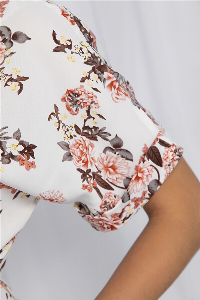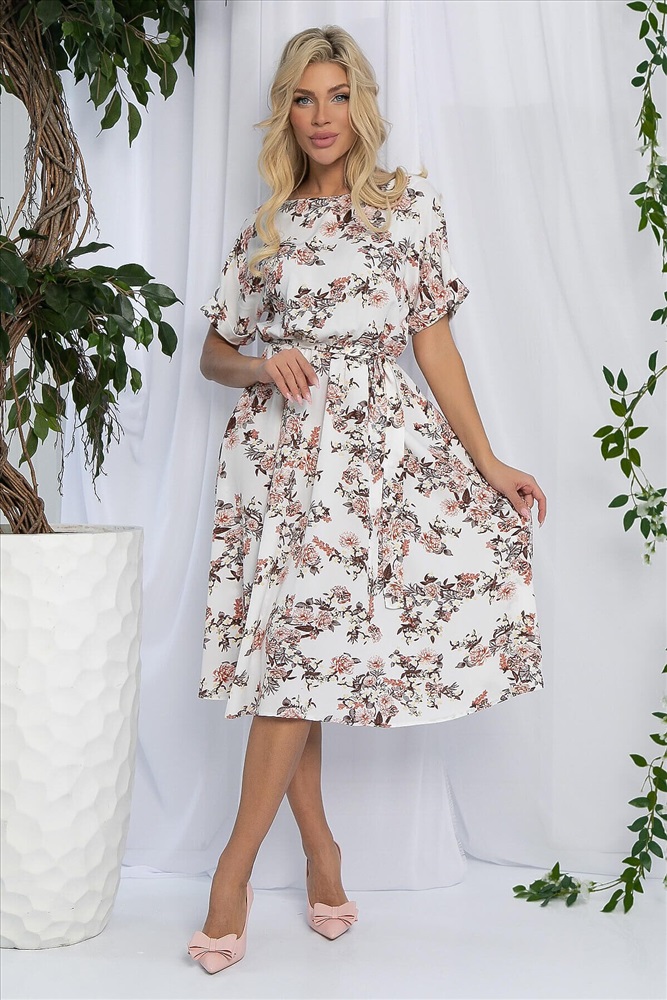 Элегантное платье с цветочным принтом — идеальный выбор для создания нежного и романтичного образа! Спущенные рукава придают ему легкость и романтичность, а V-образный вырез сзади с планкой добавляет изюминку. Платье по талии на резинке. В комплект входит пояс из основной ткани, который станет отличным завершающим штрихом к вашему образу. Это платье будет уместно как на вечерней прогулке, так и на праздничном мероприятии.