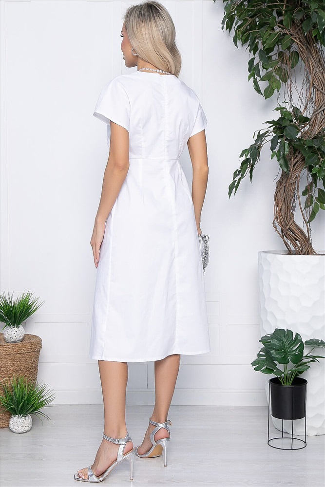 Представляем вашему вниманию изысканное белое платье, которое станет незаменимым элементом вашего гардероба! Благодаря универсальному белому цвету, это платье легко сочетается с любой обувью и аксессуарами. Дизайн платья включает в себя удлинённое плечо и безрукавный фасон, что придаёт ему утончённый вид. Сзади расположена потайная молния, которая обеспечивает удобство при надевании. V-образный вырез горловины и юбка-трапеция с разрезом спереди добавляют нотку изысканности и стиля.