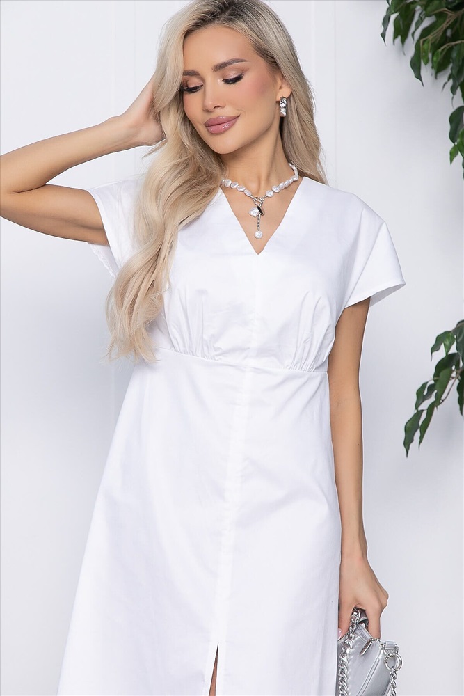 Состав: 95% хлопок, 5% эластан. Материал: хлопок стрейч. Цвет: белый. Принт: отсутствует. Длина: миди. Силуэт: приталенный. Карманы: отсутствуют. Подкладка: отсутствует. Вид застежки: сзади потайная молния. Декоративные элементы: разрез спереди. Длина: 44-46/ 107 см, 48-50/ 108 см, 52/ 109 см.