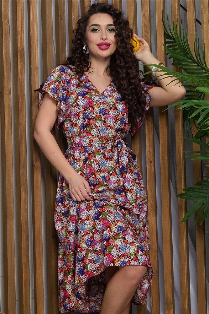 ID товара: 1114852 Состав: 50% Хлопок, 50% Вискоза Сезон: Весна/Лето Длина: Миди Фасон: А-силуэт Рукав: короткие Вырез горловины: V-образный Рисунок: Абстракция Декоративные элементы: Пояс Основная ткань: Хлопок Стиль: повседневный Страна бренда: Россия Страна производства: Россия Состав: 50% хлопок, 50% вискоза. Материал: штапель. Цвет: мультиколор. Принт: цветочный. Длина: миди. Силуэт: А-силуэт. Карманы: отсутствуют. Подкладка: отсутствует. Вид застежки: без застёжки. Декоративные элементы: отсутствуют. Длина: 46-48/ 113 см, 50-52/ 114 см, 54-56/ 115 см. Идеальное платье, для жаркой погоды, в котором вы будете чувствовать себя комфортно. В комплект входит пояс из основной ткани, который подчеркивает все достоинства фигуры. Рукав скроен по типу "крылышко". Уход за изделием: ручная стирка до 30 градусов; нельзя отбеливать; отжим запрещён; гладить при t не более 110 С; гладить с изнанки. Внимание! Рекомендуем ориентироваться на размерную сетку и выбирать свой привычный размер, согласно размерной таблице. *Допуск отклонения длины при массовом производстве 1-3 см является нормой. Комментарии к товару