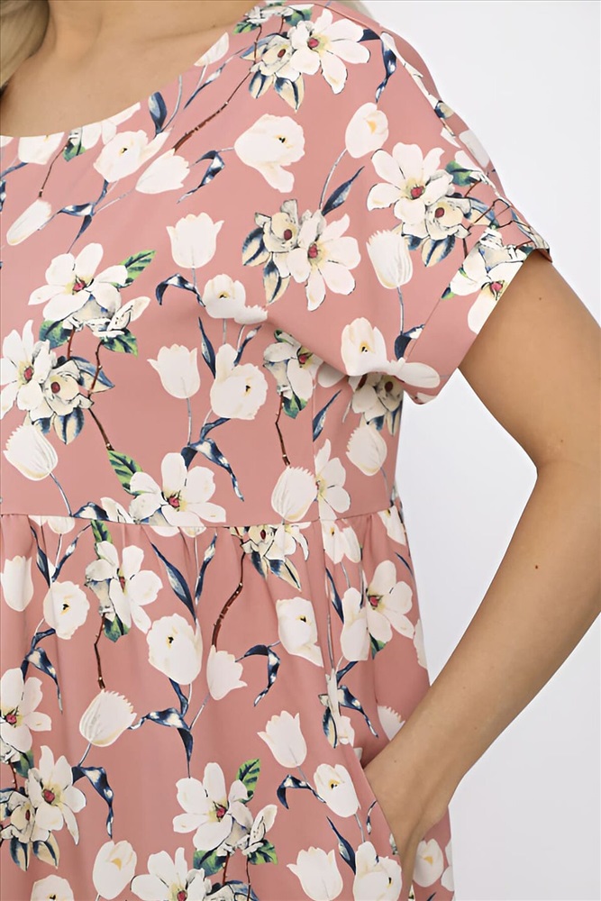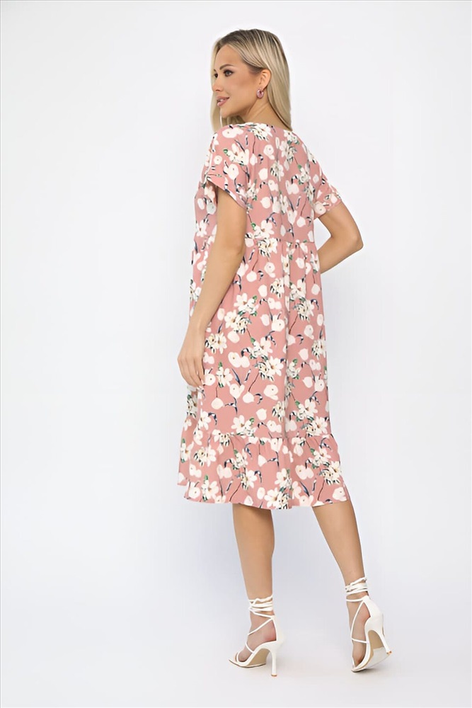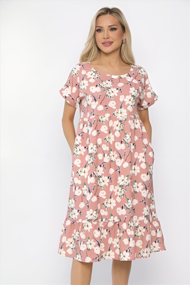 ID товара: 1124842 Состав: 65% Полиэстер, 30% Вискоза, 5% Эластан Сезон: Весна/Лето Длина: До колена Фасон: Расклешенное Рукав: Короткий Вырез горловины: Круглый Рисунок: цветочный Основная ткань: Полиэстер Стиль: Повседневный Страна бренда: Россия Страна производства: Россия Состав : 65% полиэстер, 30% вискоза, 5 эластан Материал : плательный Цвет : Розовый Принт : цветочный Длина : миди Силуэт : А-силуэт Карманы : Есть Подкладка : Отсутствует Вид застежки : без застежки Декоративные элементы : отсутствуют Длина : 44-102 см, 46-102 см, 48-103 см, 50-103 см, 52-105 см, 54-105 см. Это стильное платье свободного кроя в пудровом оттенке идеально подходит для создания комфортного и элегантного образа. Короткие цельнокроеные рукава обеспечивают свободу движений и легкость в носке. Платье оснащено удобными боковыми карманами, что добавляет практичности в повседневный стиль. Округлая горловина, обработанная обтачкой, придает изделию завершенный вид и добавляет нотку изящества. Низ платья выполнен в виде двухъярусной сборки, что создает эффектный силуэт и добавляет объема. Это платье станет отличным выбором для любого случая — от прогулок по городу до встреч с друзьями. Внимание! Рекомендуем ориентироваться на размерную сетку и выбирать свой привычный размер, согласно размерной таблице. *Допуск отклонения длины при массовом производстве 1-3 см является нормой. Уход за изделием: Ручная стирка или стирка в машине при температуре до 30 °C, деликатный режим. Не использовать отбеливатели. Разрешена глажка при температуре до 110 °C. При глажке использовать специальную насадку на подошве утюга, гладить с паром. Не замачивать и не выжимать. Стирать изделие наизнанку, отдельно от других вещей. Комментарии к товару