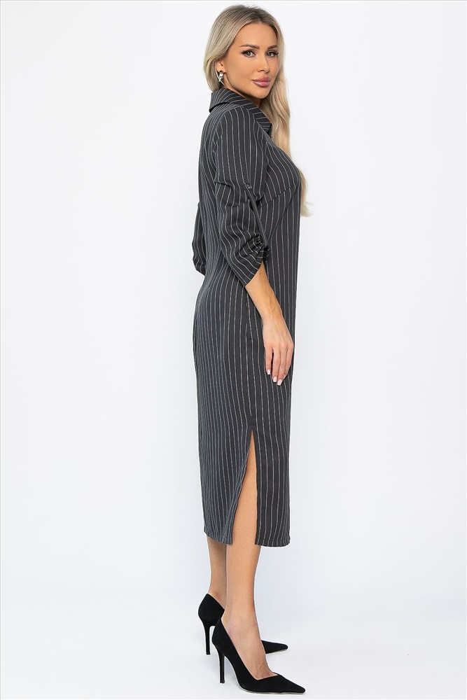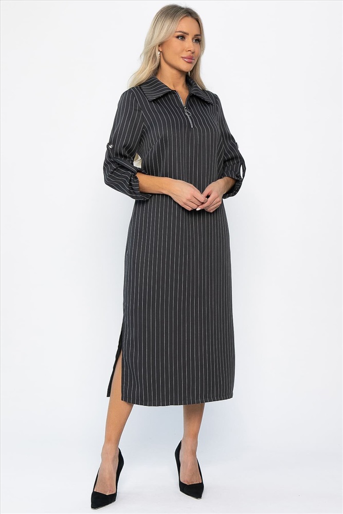 Платье прямого кроя в оттенке графит станет идеальным выбором для повседневных рабочих дней и официальных мероприятий. Удобные боковые разрезы придают образу динамичность и легкость. Рукава длиной три четверти изящно завершаются патой с пуговицей, добавляя изделию утонченности. Отложной воротник создает классический и элегантный вид. Это платье станет отличным выбором для тех, кто ценит комфорт и стиль в деловой обстановке.