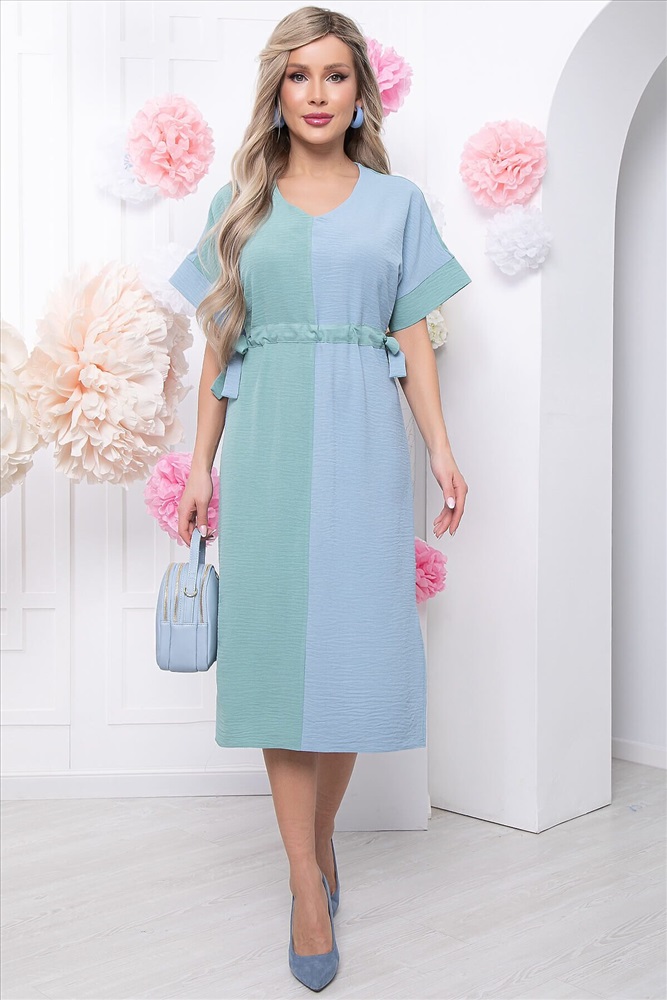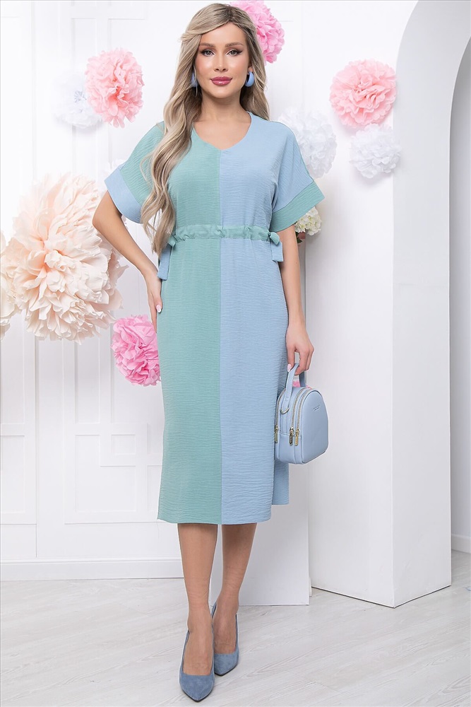 Артикул: П5756. Ткань: костюмная "Дорна" жаккард. Состав: 95% п/э, 5% эластан. Цвет: фисташка, голубой. Вид застежки: отсутствует. Силуэт: прямой. Карманы: отсутствуют. Тип горловины: V-образный. Длина изделия по спинке: 46-50/ 115 см, 52-56/ 116 см. Рост модели: 168 см.