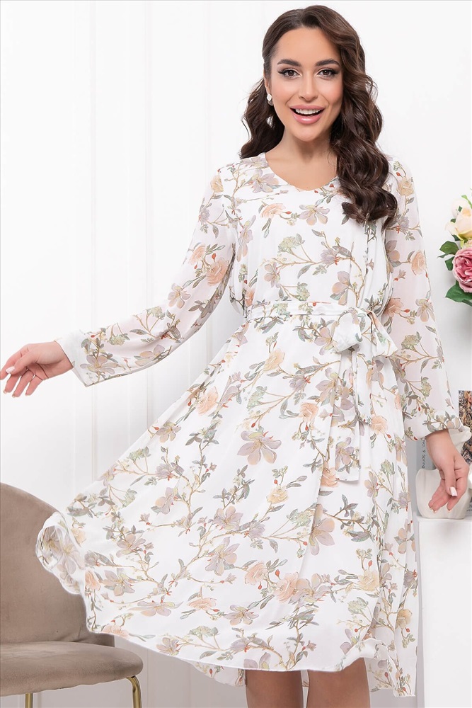 Шифоновое летящее платье идеально подчёркивающее Вашу женственность. Платье свободного силуэта на подкладке. Мягкий V-образный вырез горловины красиво открывает зону декольте и Ваши ключицы. Длинный, втачной рукав, низ на резинке. Пояс из основной ткани входит в комплект.