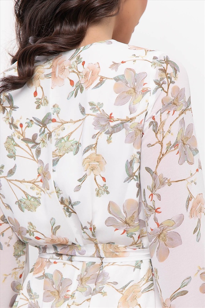 Артикул: П5779. Ткань: шифон, подкладка. Состав: 88% п/э, 12% вискоза. Цвет: белый. Принт: флористический. Вид застежки: без застежки. Силуэт: А-силуэт. Карманы: отсутствуют. Тип горловины: мягкий V-образный. Длина изделия по спинке: 46/ 113 см, 48/ 113 см, 50/ 114, 52/ 115 см, 54/ 116 см. Рост модели: 167 см.