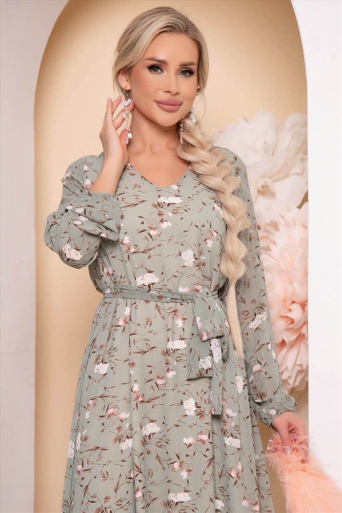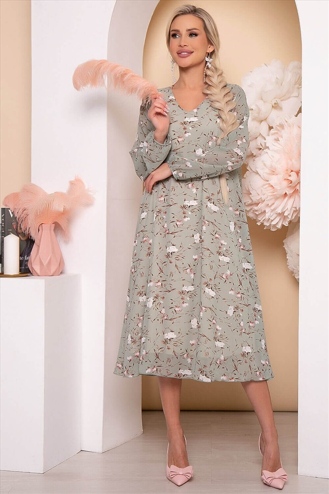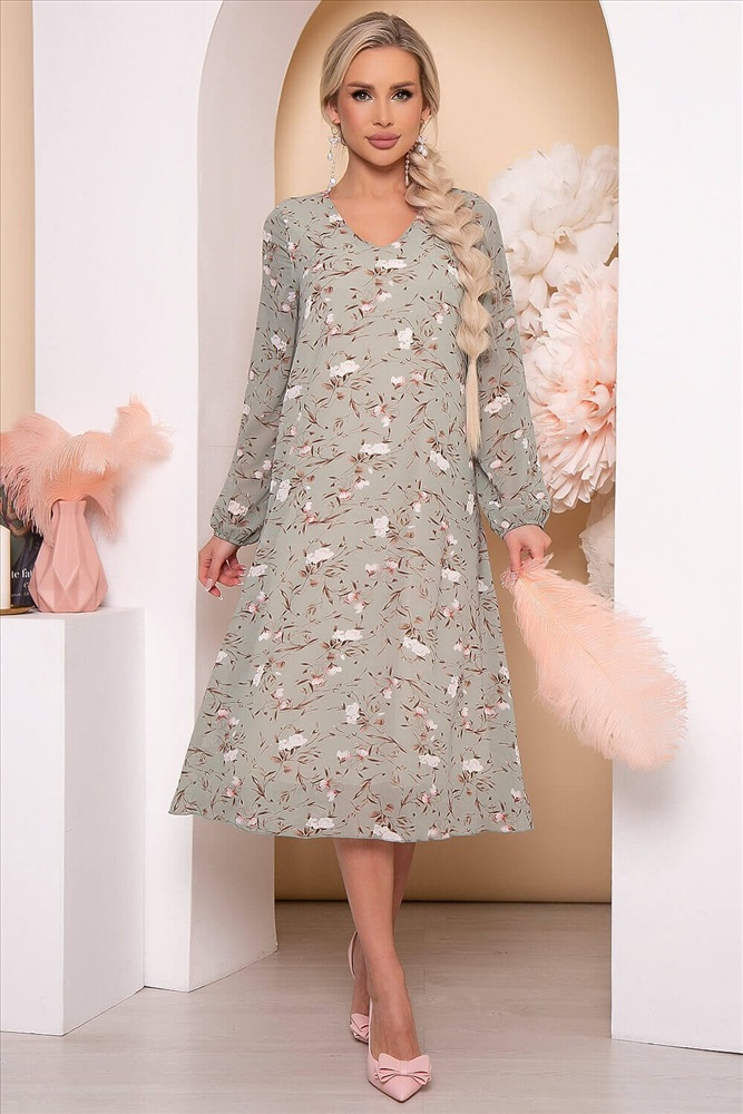 Артикул: П5778. Ткань: шифон, подкладка. Состав: 88% п/э, 12% вискоза. Цвет: оливковый. Принт: флористический. Вид застежки: без застежки. Силуэт: А-силуэт. Карманы: отсутствуют. Тип горловины: мягкий V-образный. Длина изделия по спинке: 46/ 113 см, 48/ 113 см, 50/ 114, 52/ 115 см, 54/ 116 см. Рост модели: 168 см.