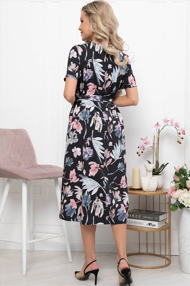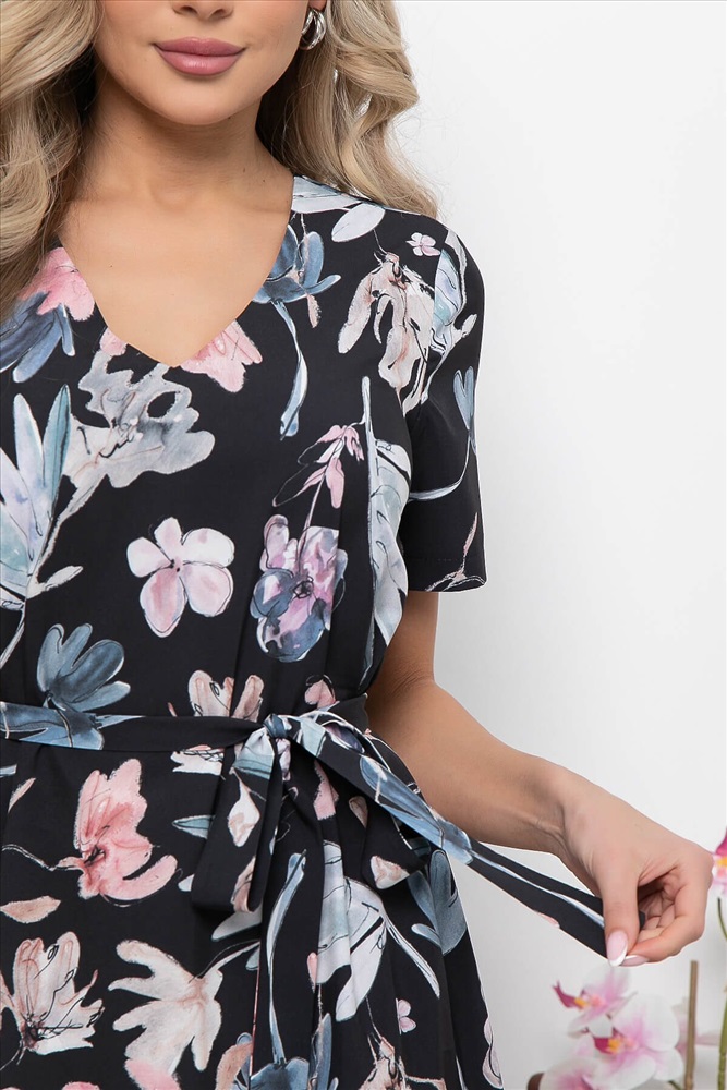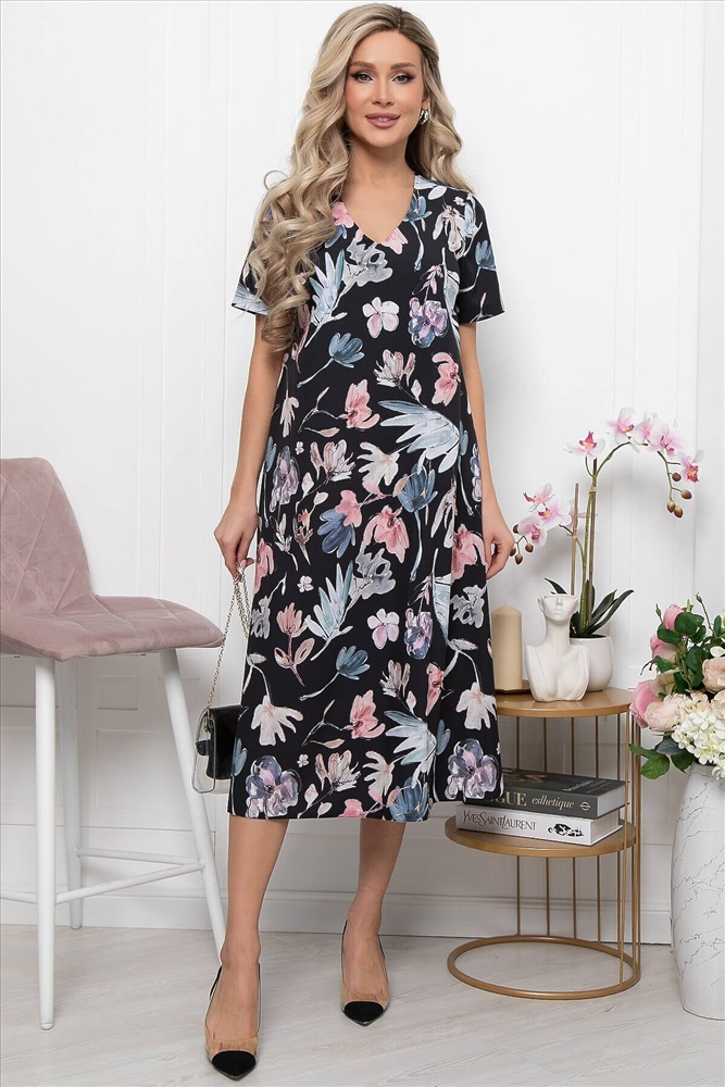 Артикул: П5736. Ткань: плательная. Состав: 95% п/э, 5% эластан. Цвет: чёрный. Принт: флористический. Вид застежки: без застежки. Силуэт: А-силуэт. Карманы: отсутствуют. Тип горловины: V-образный. Длина изделия по спинке: 44/ 114 см, 46 / 115 см, 48 / 116 см, 50 / 117, 52 / 118 см, 54 / 119 см. Рост модели: 168 см.
