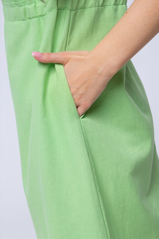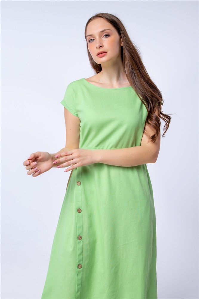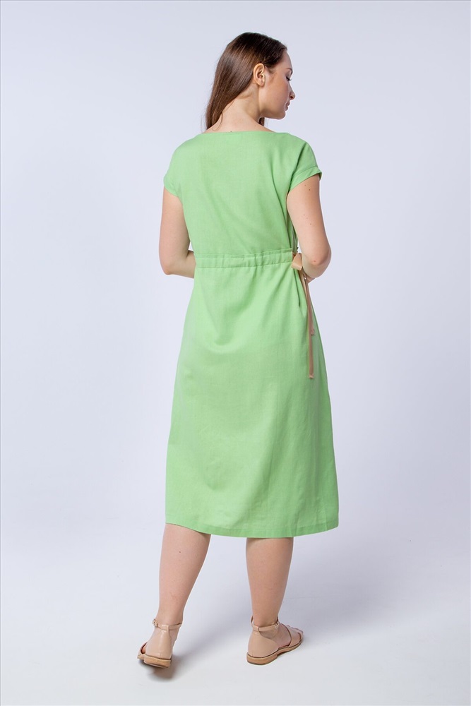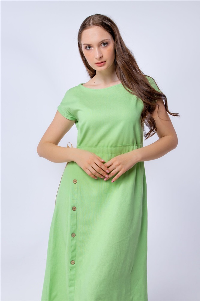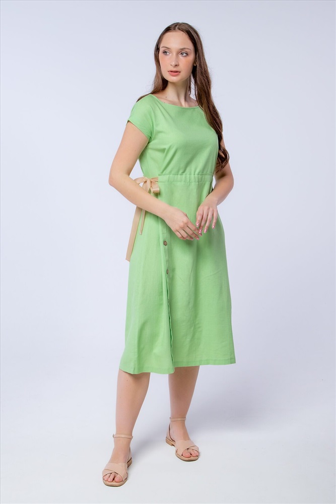 Женское платье с акцентом на талии разработано специально для жарких летних дней. Благодаря свободной посадке платья в нём будет комфортно на улице, а длинна и фасон позволяют ему любимчиком в офисном гардеробе. Пояс с завязкой сбоку, выгодно подчеркнёт талию, а вертикальный ряд пуговиц на юбке вытянет силуэт и сделает его стройнее. Лён, из которого выполнено платье, является экологичным и дышащим материалом. Пуговицы из дерева отлично дополняют дизайн платья.
