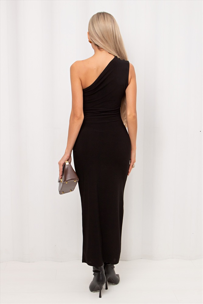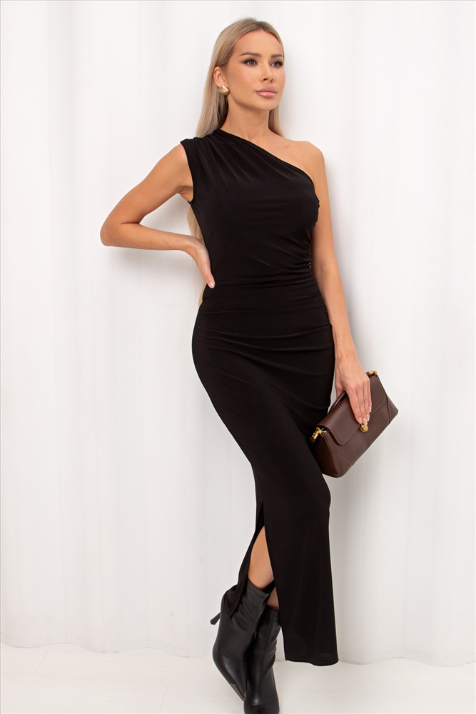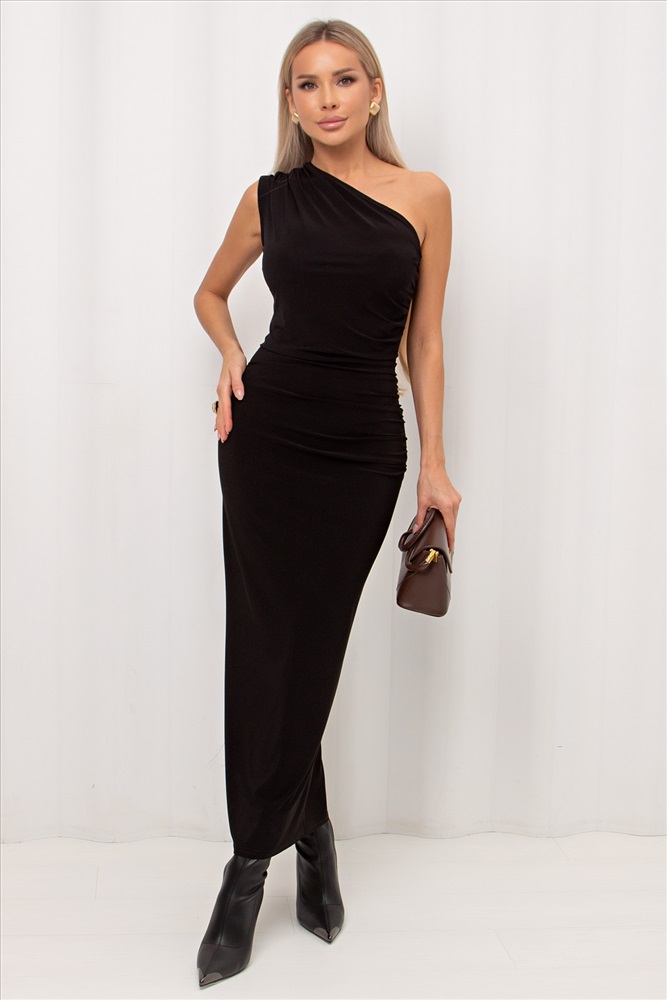 Вечернее платье облегающего силуэта выполнено из легкого трикотажного полотна. Платье на одно плечо, с драпировкой. С боку по ноге разрез.