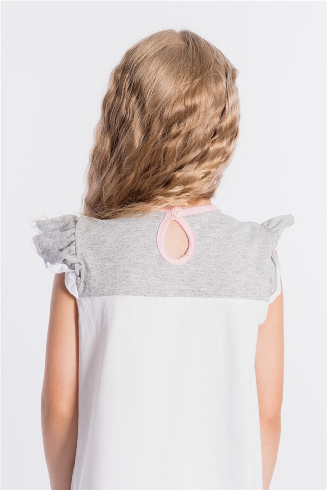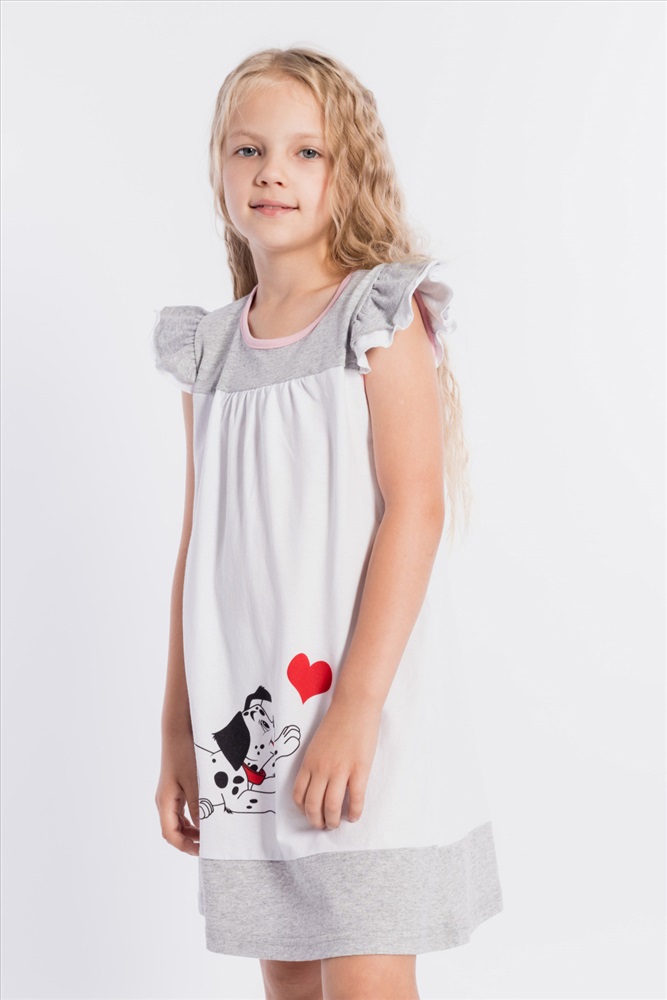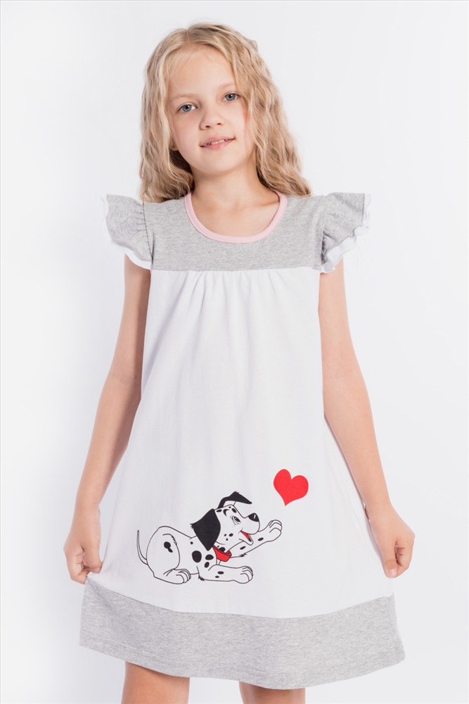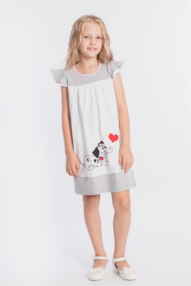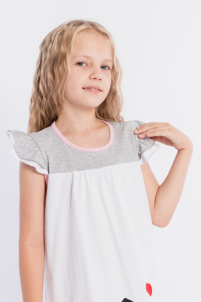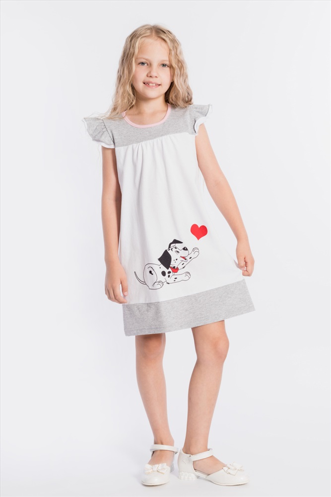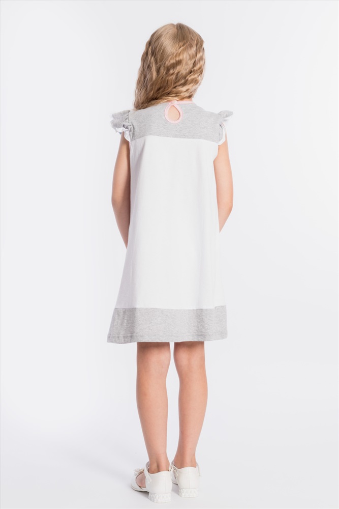 Тип длинны (для платьев): До колена Вид ткани: Кулирка Сезон: Летний Состав: Хлопок 100% Цвет Номенклатуры: белый Платье выполнено из хлопкового полотна двух цветов. Спереди нанесен красивый принт. Двойные крылышки так же являются украшением платья, горловина и проймы обработаны бейкой. Сзади декоративный вырез и застёжка на пуговицу. Комментарии к товару