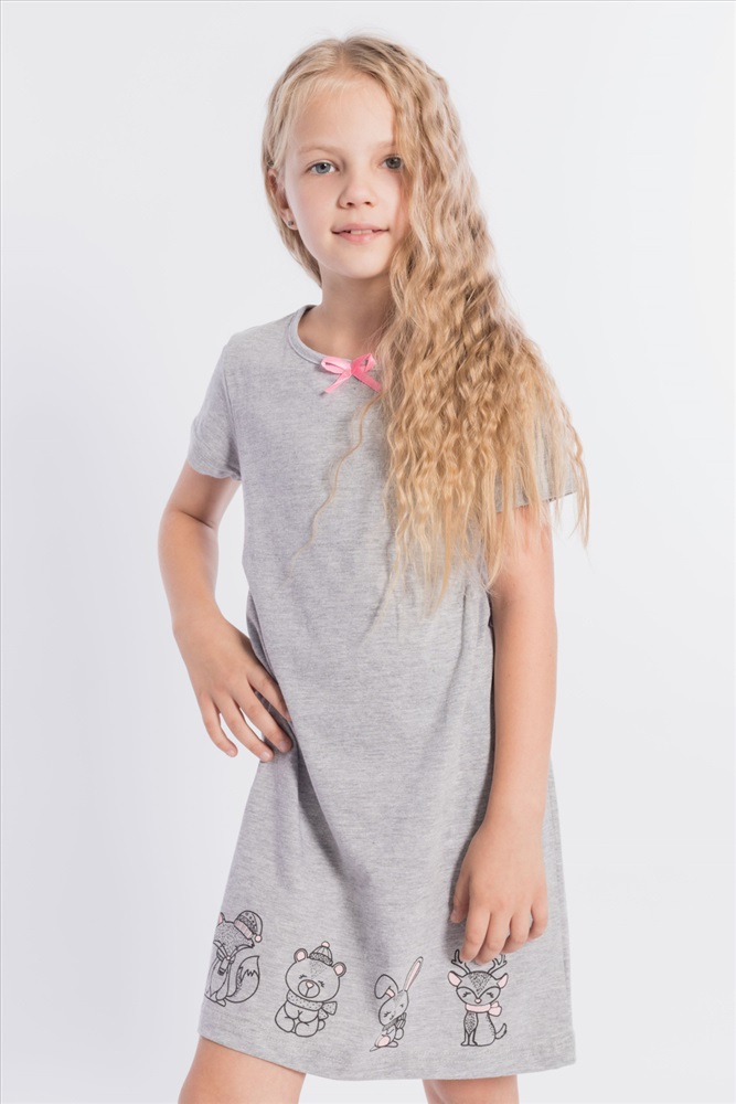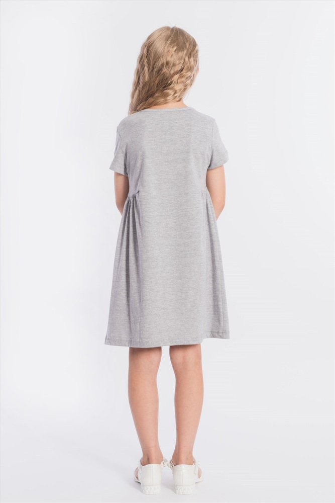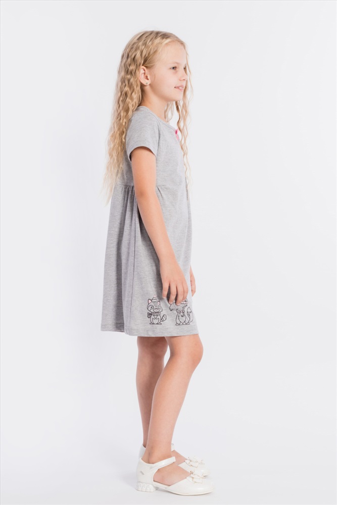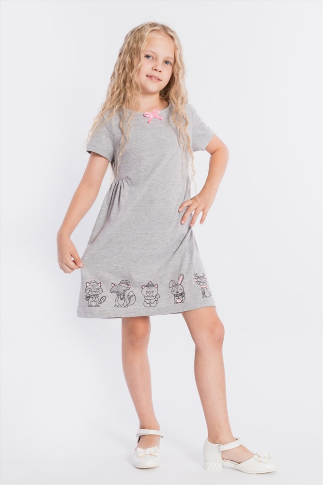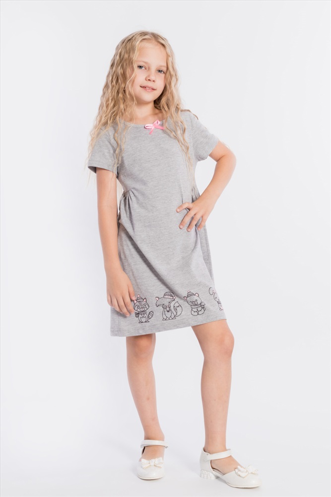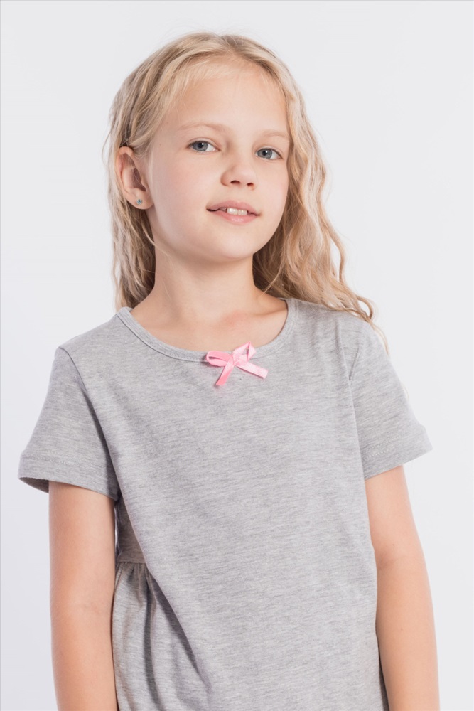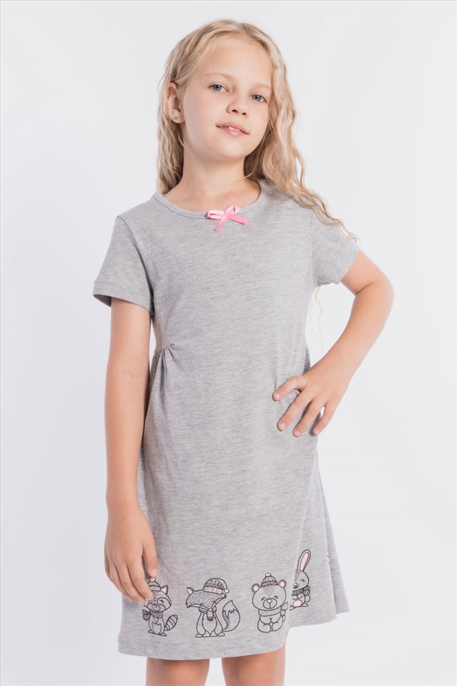 Тип длинны (для платьев): До колена Вид ткани: Кулирка меланжевая Сезон: Всесезонный Состав: Хлопок 100% Цвет Номенклатуры: меланж Платье выполнено из меланжевой кулирки, 100% хлопок. С коротким втачным рукавом, с подрезами на полочке и спинке, нижняя часть подрезов со сборкой. Спереди нанесён принт. На горловине расположен декоративный бантик. Комментарии к товару