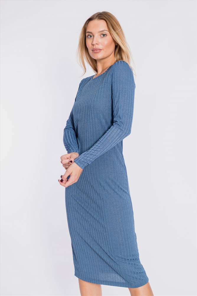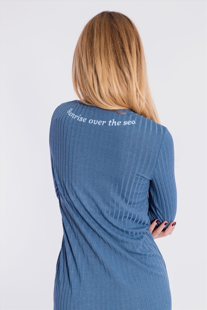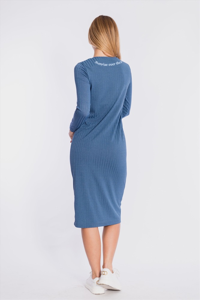 Цвет Номенклатуры: индиго Платье из однотонной рибаны в широкий рубчик. С длинным втачным рукавом, овальной горловиной, обработанной бейкой. Длина платья ниже колена. На спинке нанесена термопечать.