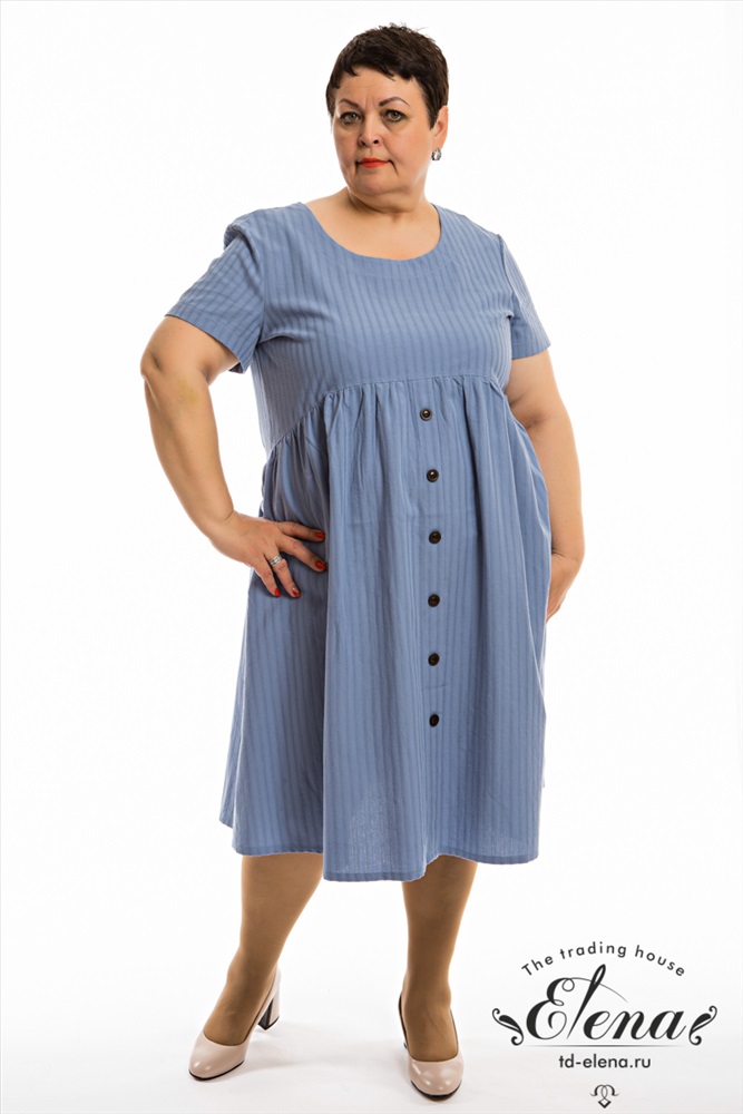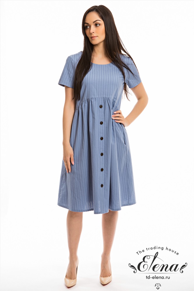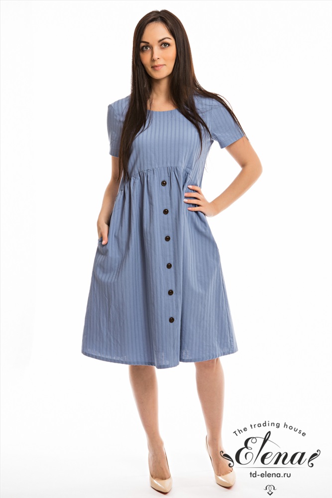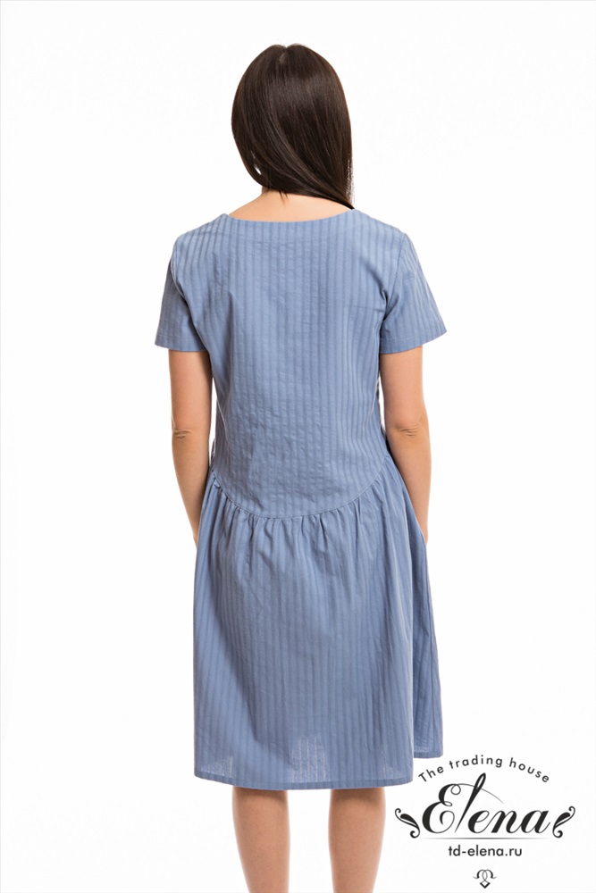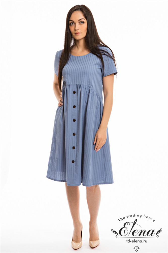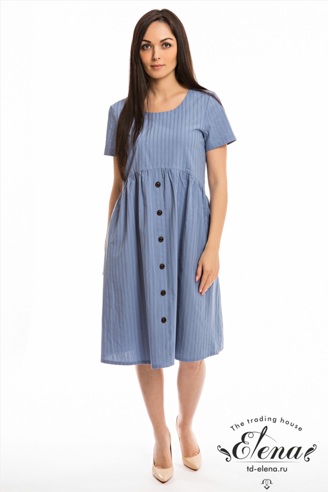 Тип длинны (для платьев): До колена Вид ткани: Жаккард Сезон: Летний Состав: Хлопок 100% Цвет Номенклатуры: индиго Платье из однотонного хлопка жаккард. С коротким втачным рукавом и овальным вырезом горловины. Спереди и на спинке фигурная линия отреза юбки. Юбка со сборкой, спереди застрочена складка, имитирующая застёжку на пуговицы. В боковых швах расположены карманы. Комментарии к товару