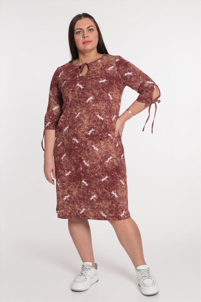 Тип длинны (для платьев): До колена Вид ткани: Кулирка Сезон: Летний Состав: Хлопок 100% Цвет Номенклатуры: коричневый Платье из кулирки с набивным рисунком, с рукавом длиной 3/4. С карманами в боковых швах. На полочке нагрудные вытачки, декоративные "капельки" с завязками по горловине и низу рукавов. Комментарии к товару