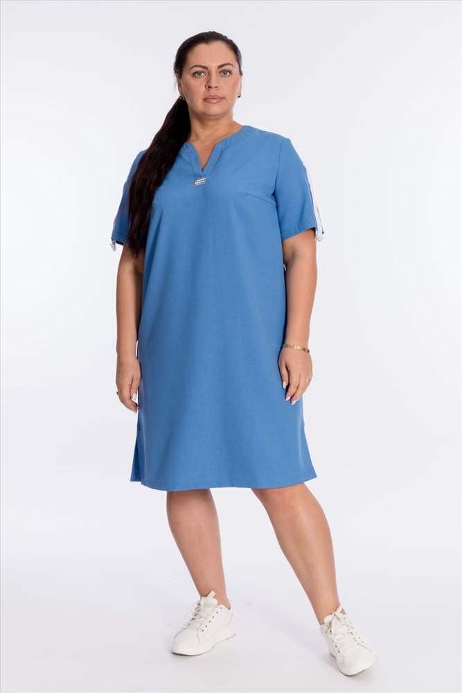 Цвет Номенклатуры: голубой Платье прямого силуэта выполнено из однотонного искусственного льна. С втачным рукавом до локтя. Длина рукавов регулируется киперной лентой с полукольцами. Горловина обработана планками. Внизу расходящихся планок - нашивка. Внизу, по боковым швам платья разрезы.