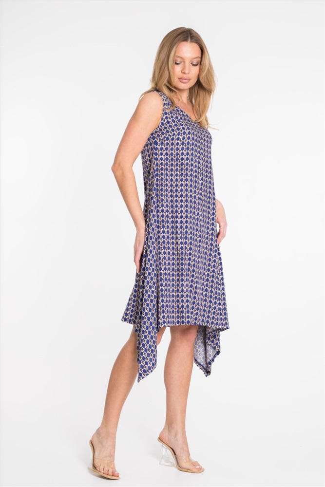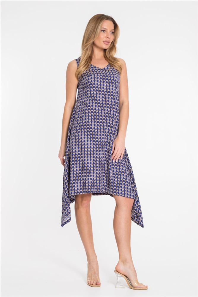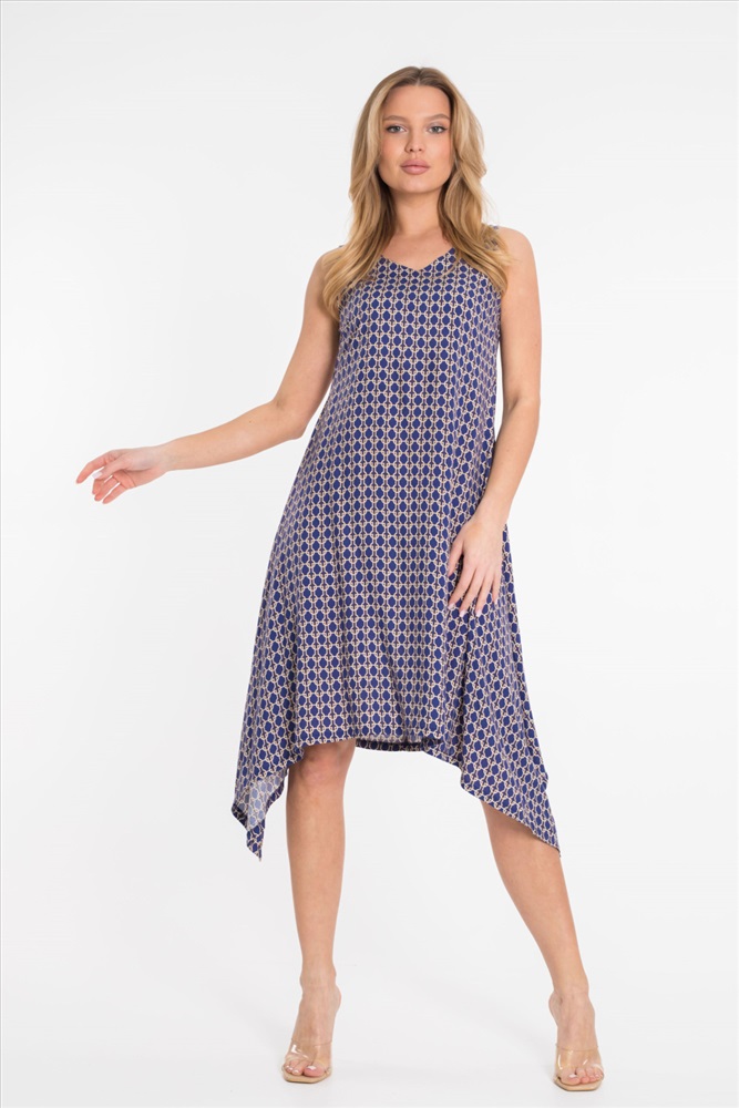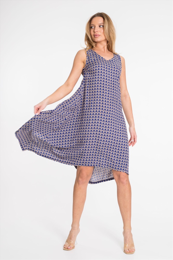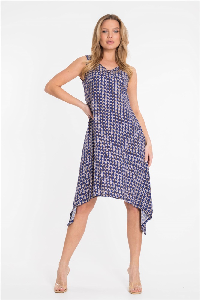 Цвет Номенклатуры: синий Платье из штапеля с набивным рисунком. Вырез горловины V-образный, низ платья разноуровневый - боковые стороны длиннее.