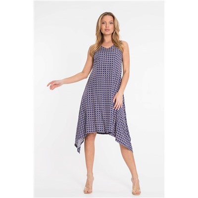 Платье из штапеля с набивным рисунком. Вырез горловины V-образный, низ платья разноуровневый - боковые стороны длиннее.