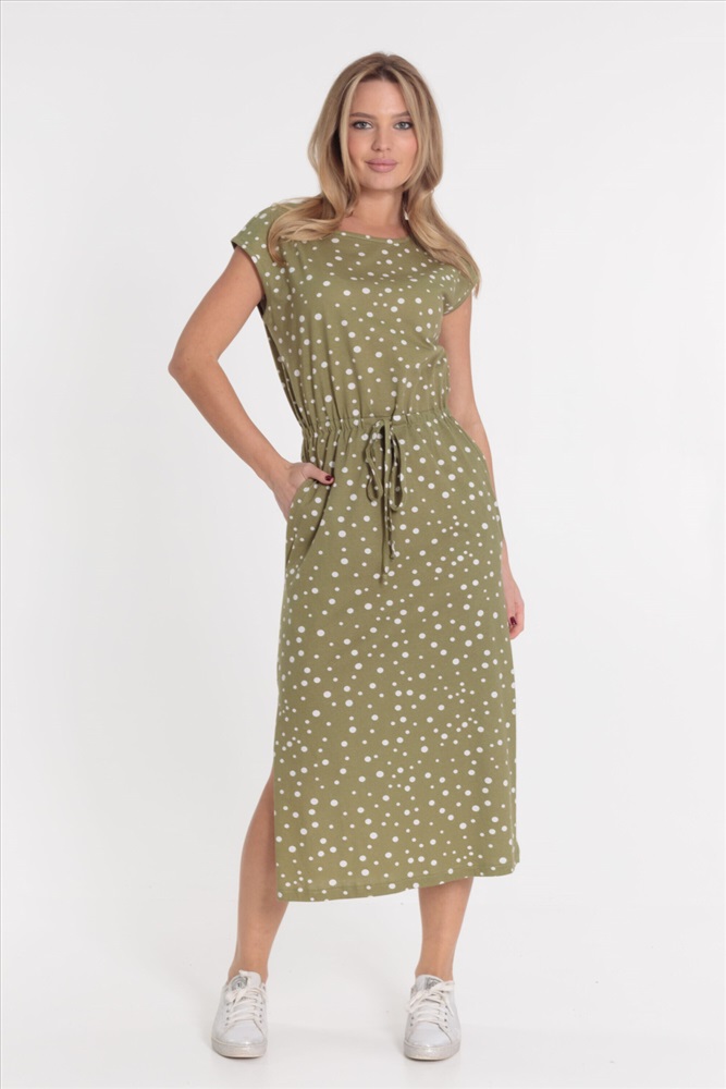 Тип длинны (для платьев): Миди Вид ткани: Кулирка Сезон: Летний Состав: Хлопок 100% Цвет Номенклатуры: белый/зеленый Платье со спущенной линией плеча выполнено из кулирки. Отрезное по линии талии, с кулиской, в которую продёрнут шнур. По бокам размещены карманы. По низу боковых швов разрезы. Комментарии к товару