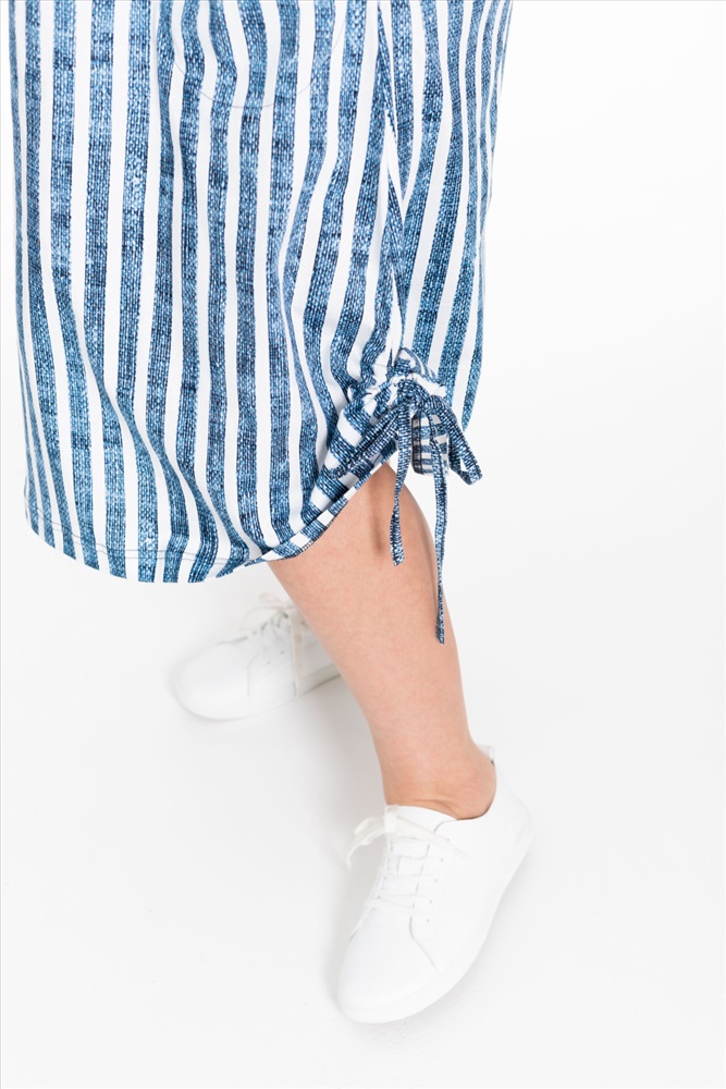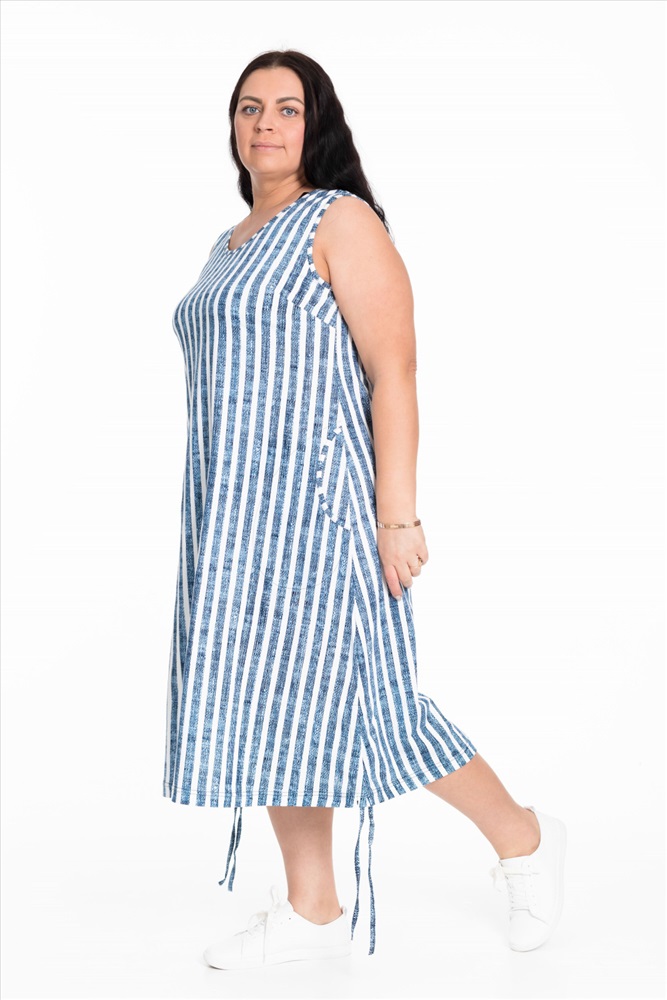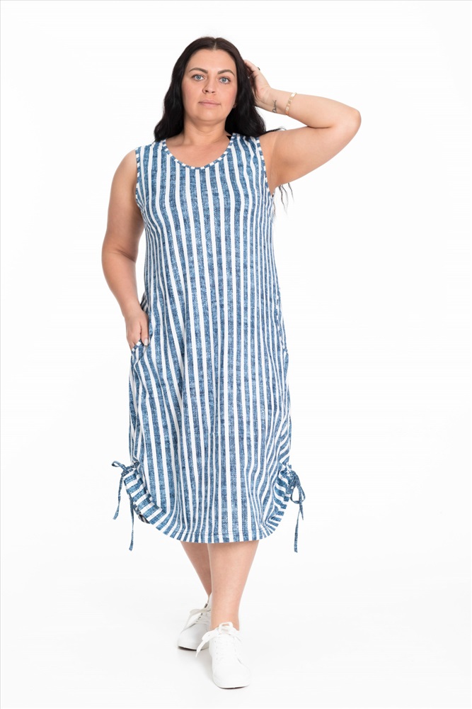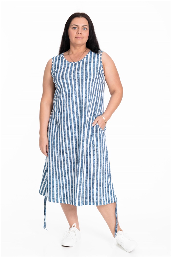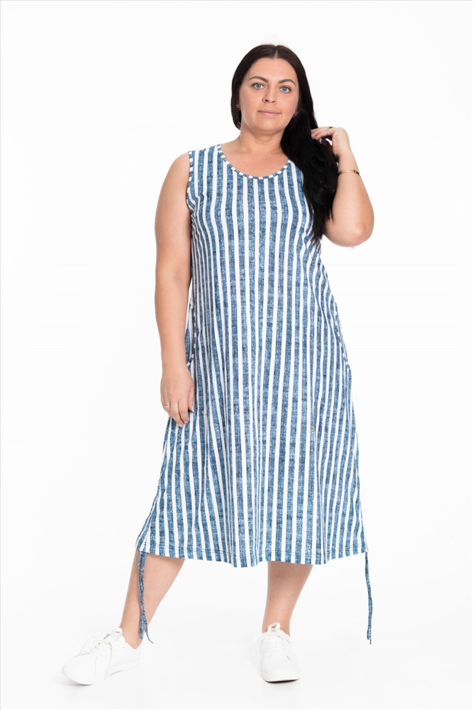 Тип длинны (для платьев): Миди Вид ткани: Кулирка Сезон: Летний Состав: Хлопок 100% Цвет Номенклатуры: белый/голубой Платье выполнено из х/б полотна в вертикальную полоску. В боковых швах размещены карманы. Горловина и проймы обработаны бейкой. Внизу, по бокам расположены кулисы со шнурами. Комментарии к товару