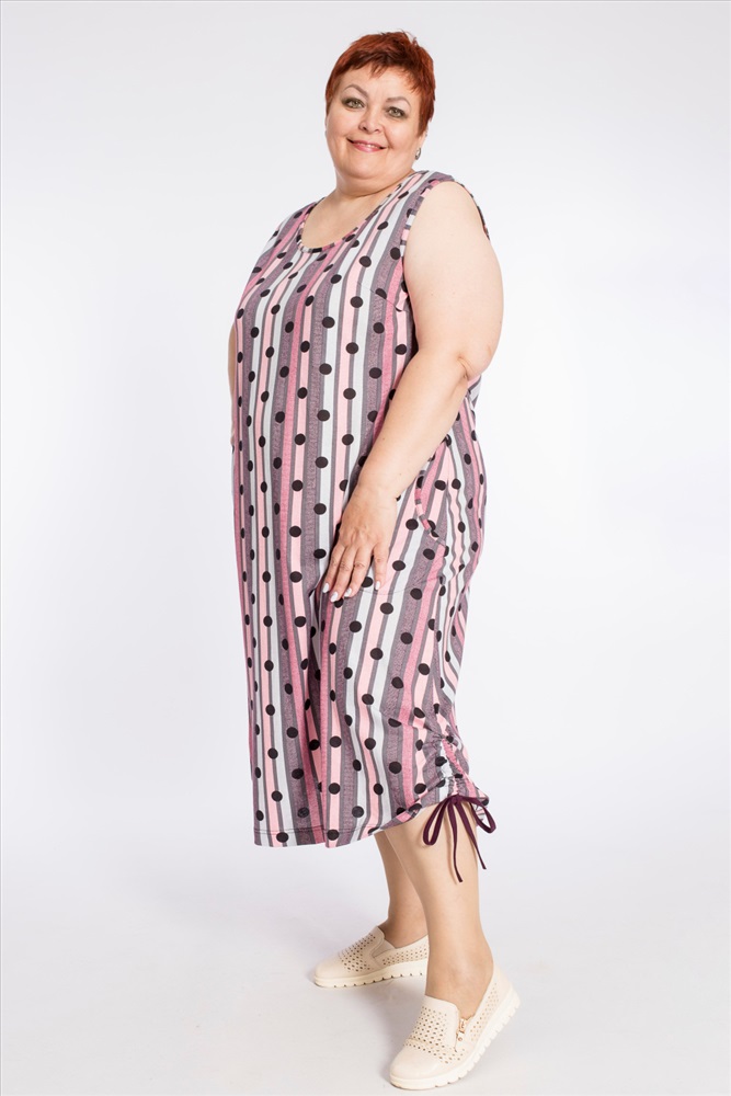 Тип длинны (для платьев): Миди Вид ткани: Кулирка Сезон: Летний Состав: Хлопок 100% Цвет Номенклатуры: розовый/серый Платье выполнено из кулирки, 100% хлопок. В боковых швах размещены карманы. Горловина и проймы обработаны бейкой. Внизу, по бокам расположены кулисы со шнурами. Комментарии к товару