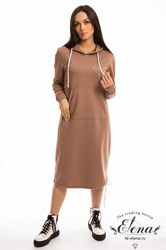Платье выполнено из футера с лайкрой. Спереди расположен карман "кенгуру" и нанесён оригинальный принт. В капюшоне и по низу платья вставлен шнур. С левой стороны, снизу, расположен небольшой разрез.