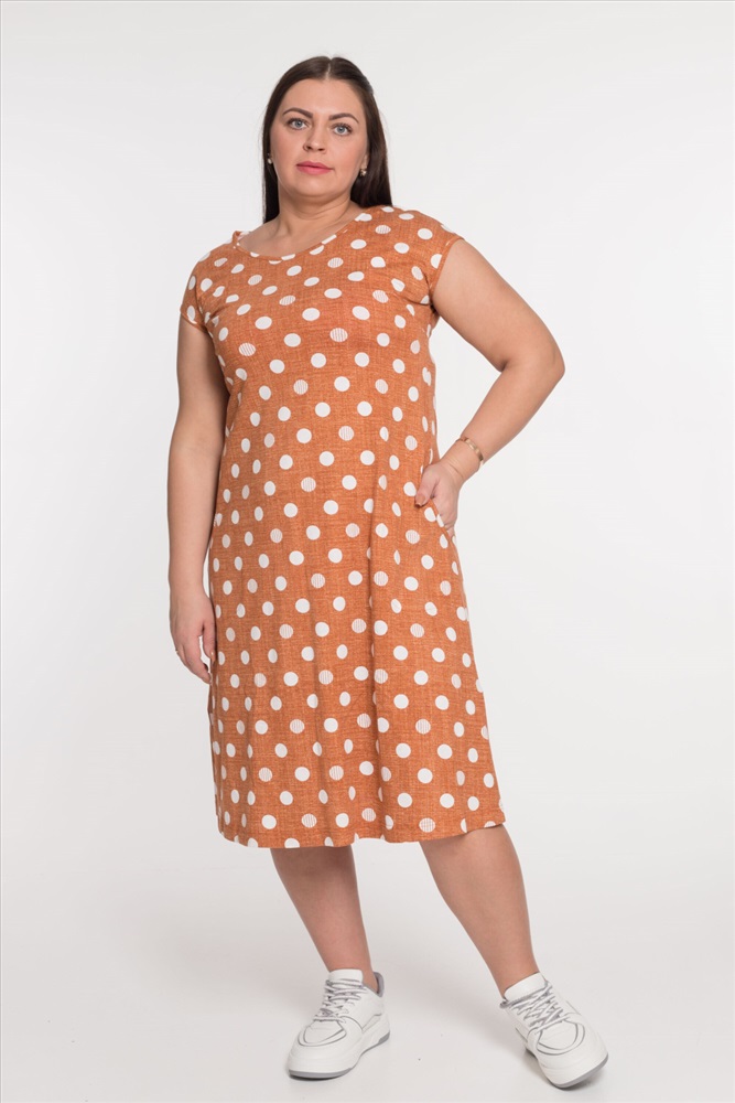 Платье из х/б полотна с набивным рисунком. Проймы, горловина и срезы карманов обработаны бейкой. По бокам размещены карманы, а внизу платья - разрезы.