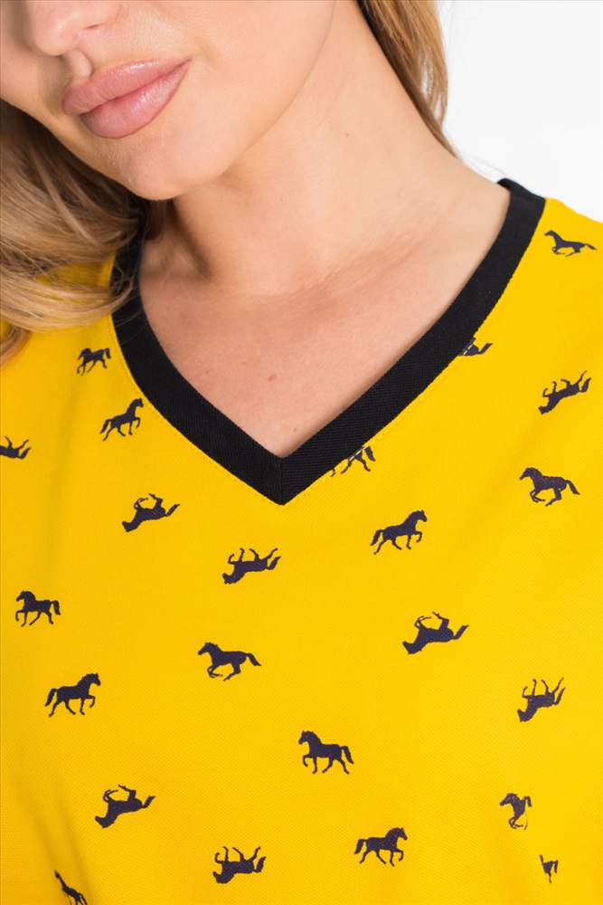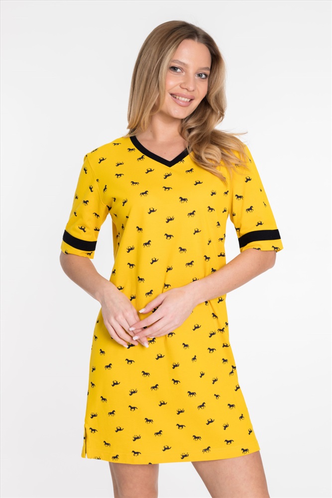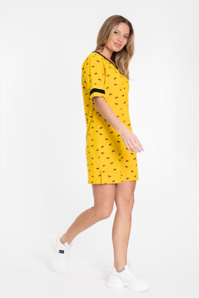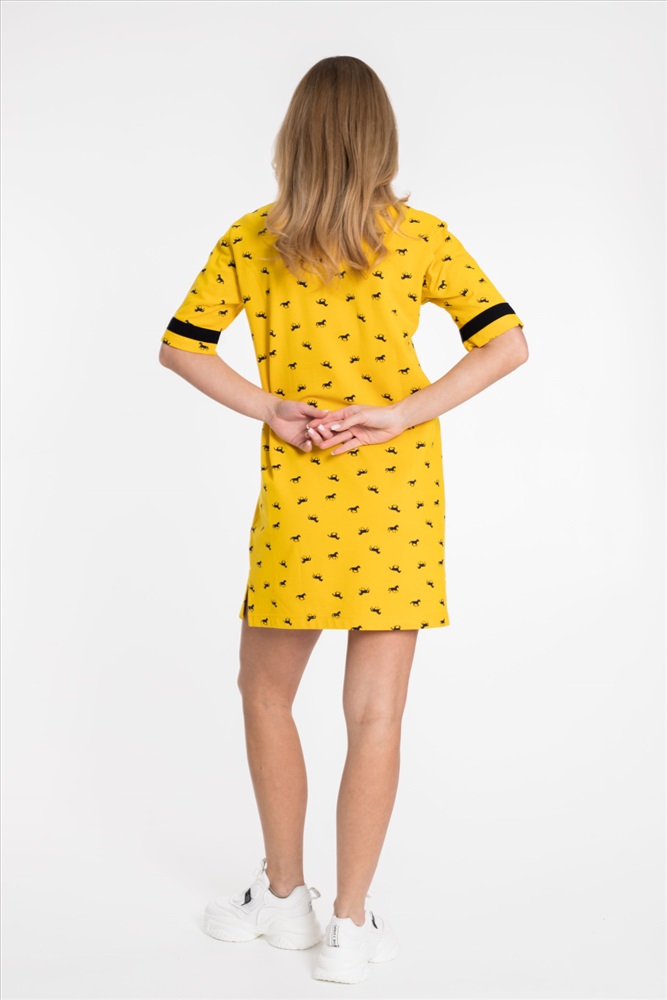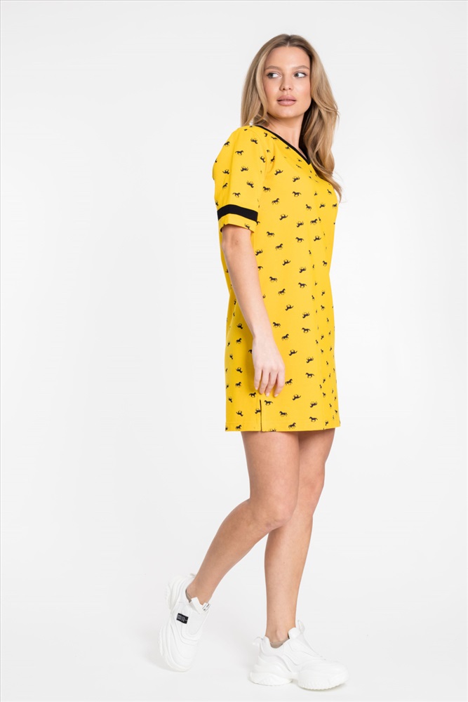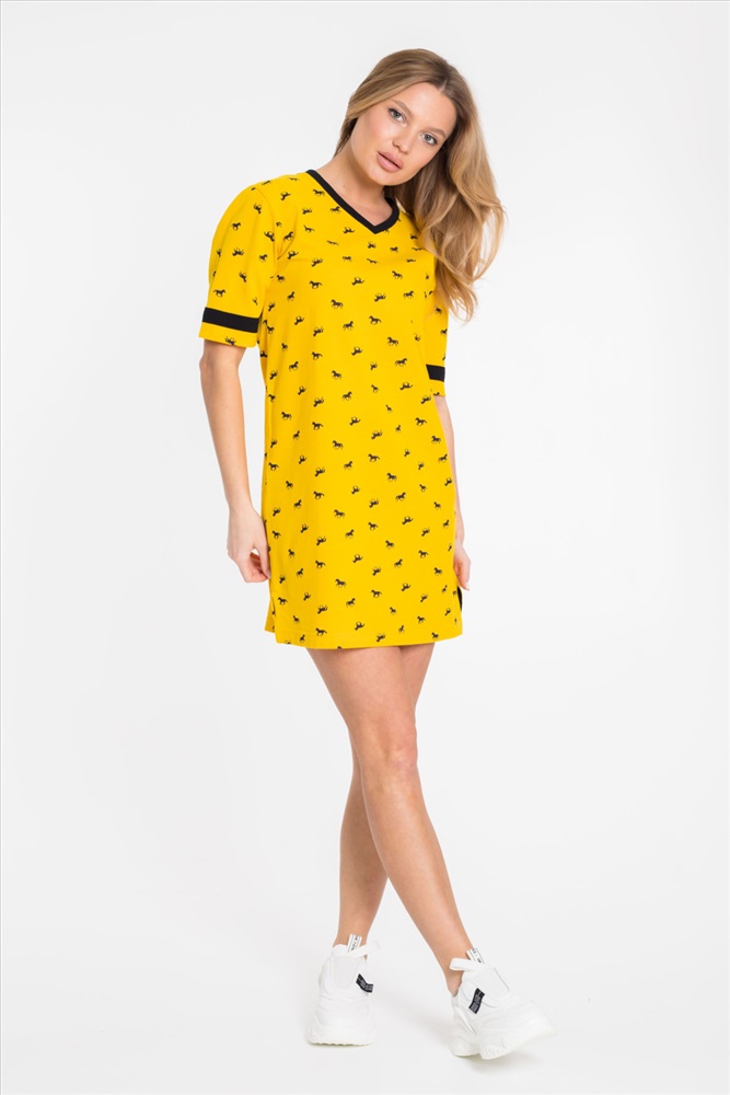 Сезон: Летний Силуэт: Прямой Состав: Хлопок 100% Цвет Номенклатуры: желтый Платье спортивного стиля из полотна пике с набивным рисунком. Платье со спущенным рукавом длиной до локтя. Горловина V-образная, с планкой. Лампасы на рукавах и планка по горловине из отделочного полотна. Внизу боковых швов разрезы. Комментарии к товару