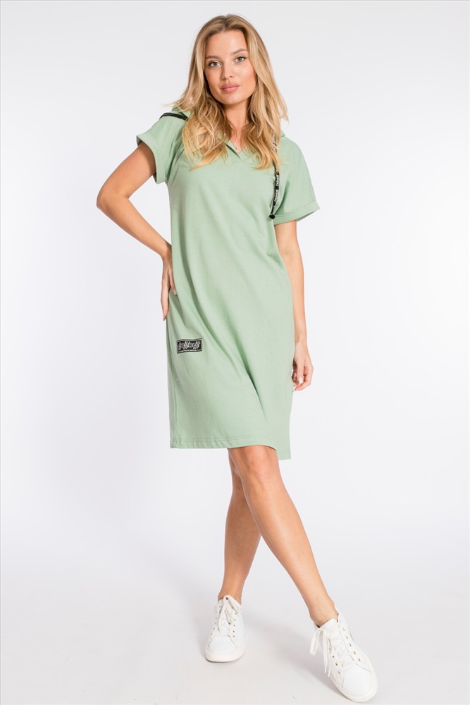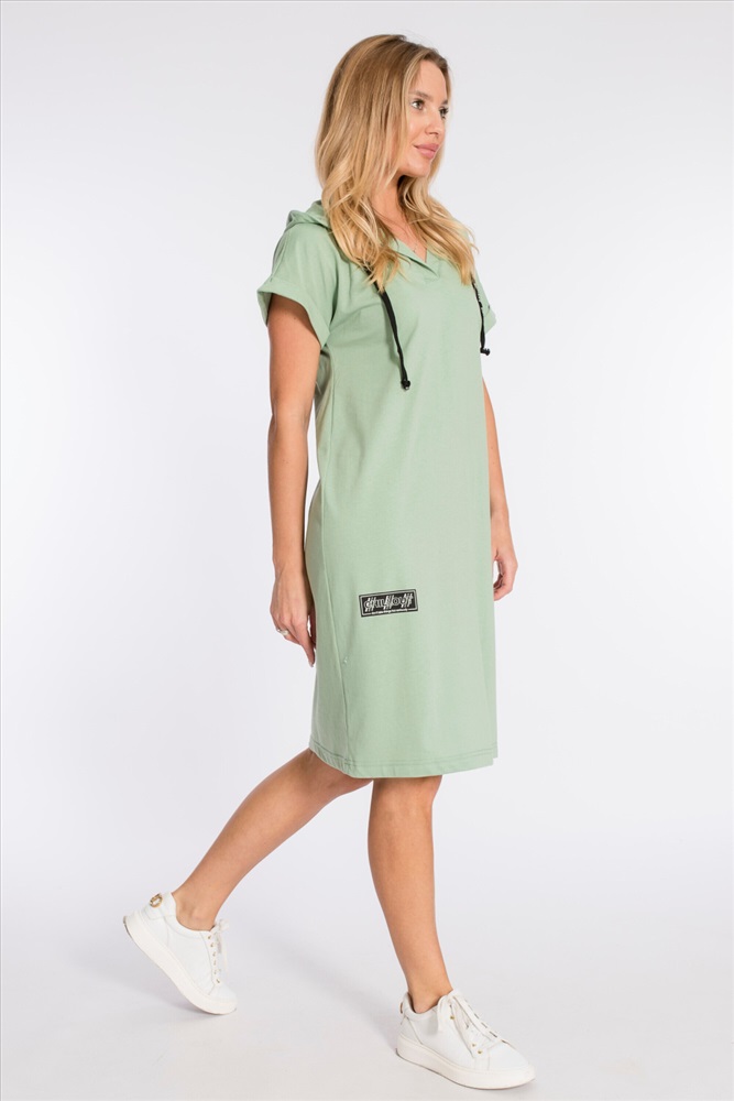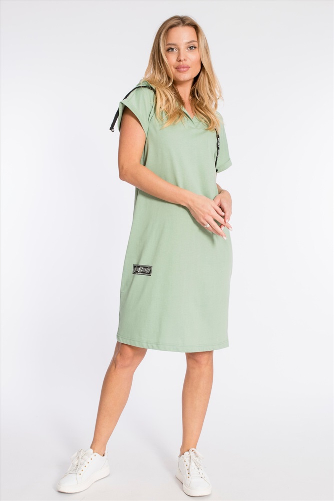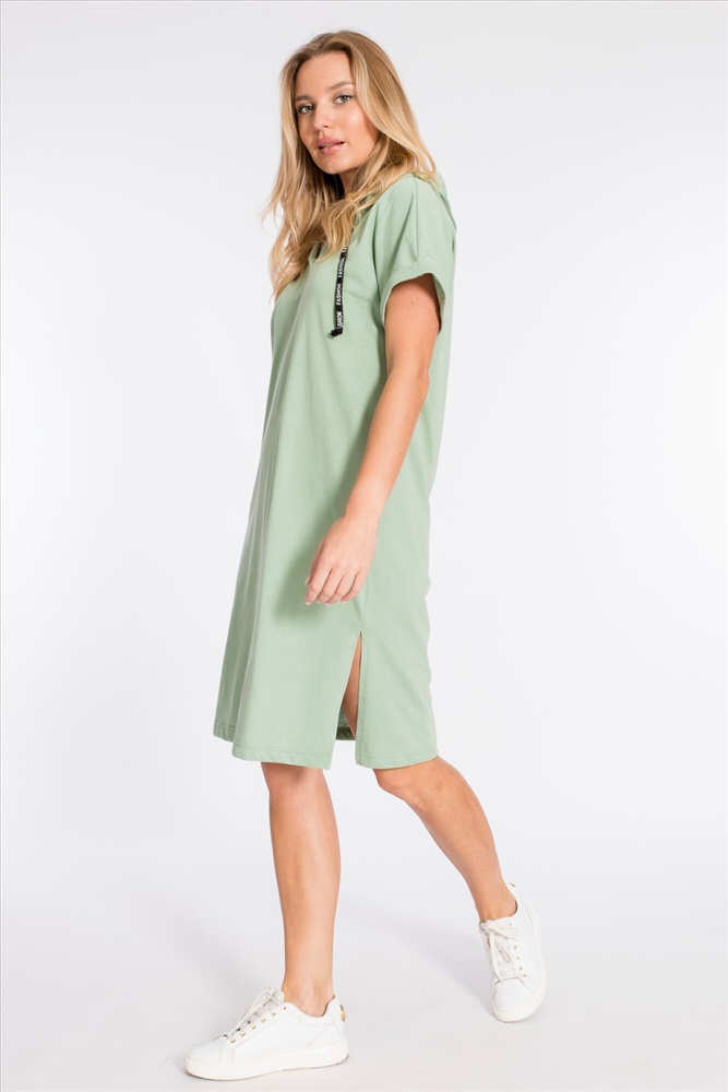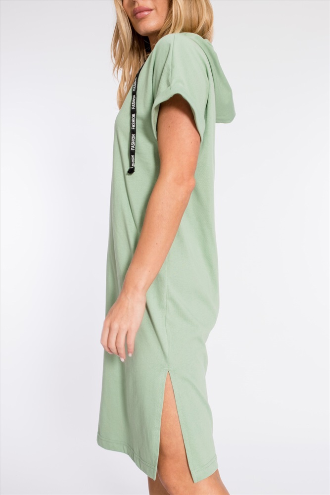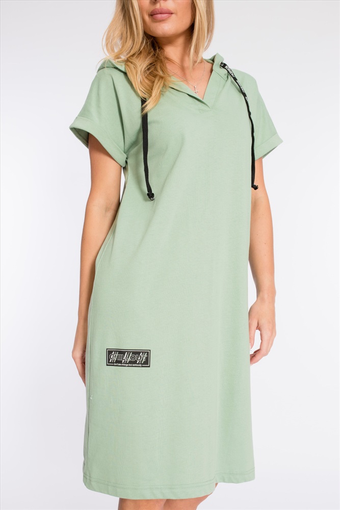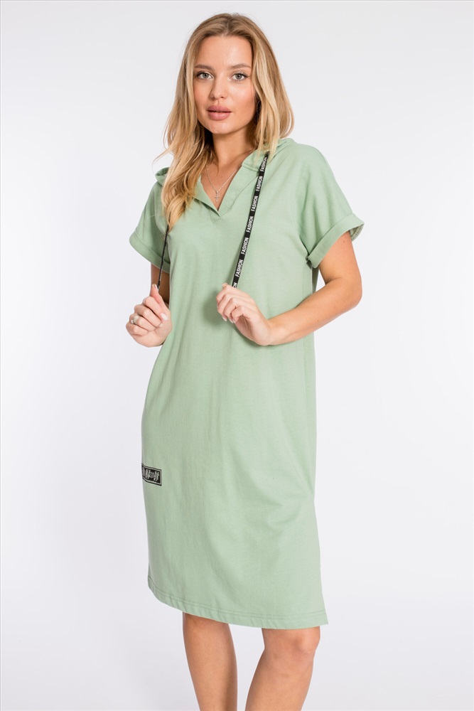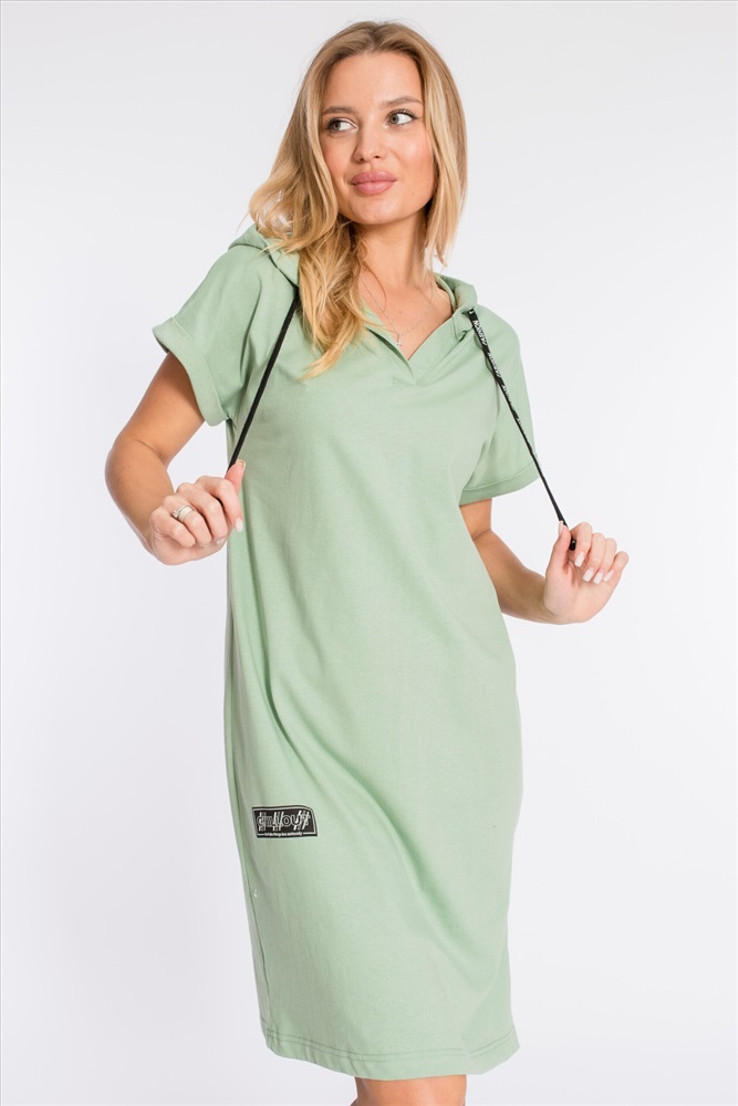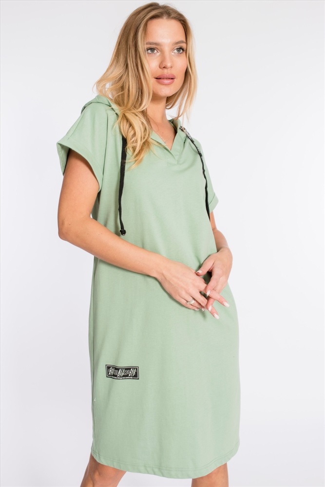 Тип длинны (для платьев): Миди Вид ткани: Кулирка Сезон: Летний Состав: Хлопок 100% Цвет Номенклатуры: полынь Платье выполнено из плотной однотонной кулирки. Ширина капюшона регулируется при помощи шнура. Линия плеча спущена, рукава короткие, манжета с отворотом. С левой стороны, снизу, расположен небольшой разрез, с правой - нанесён принт. Комментарии к товару