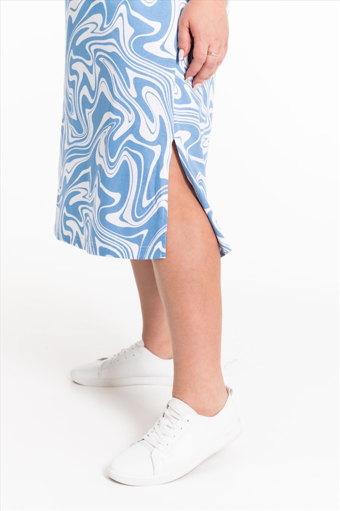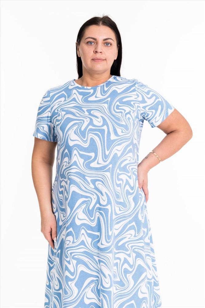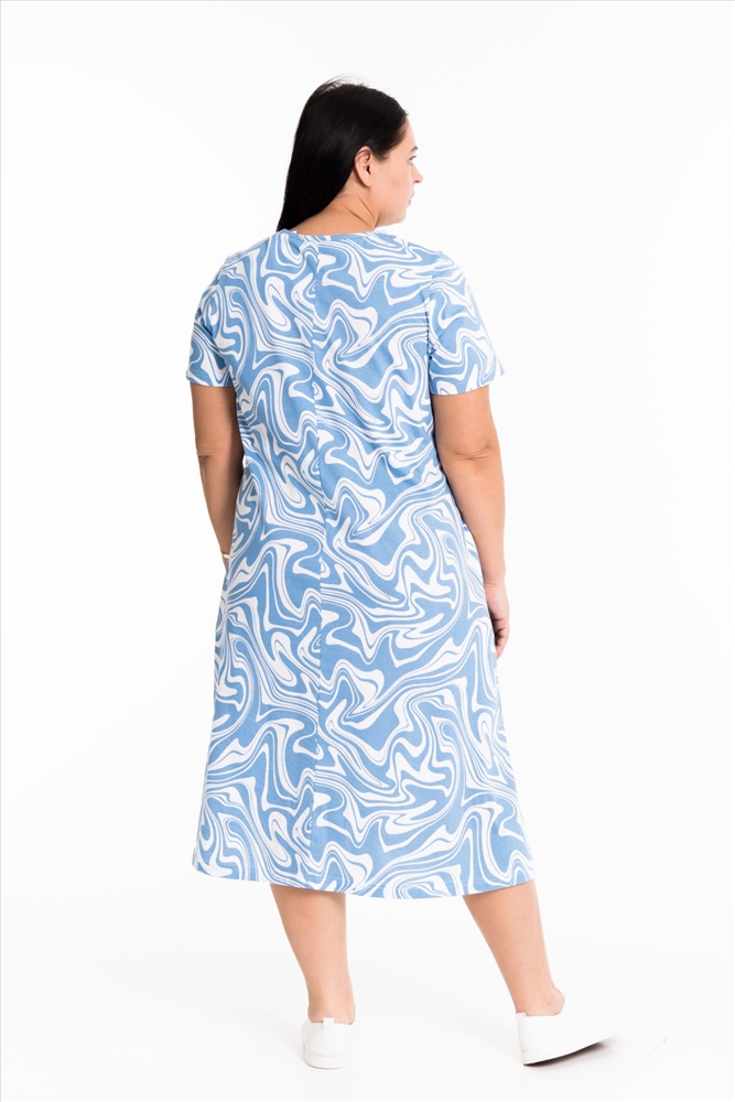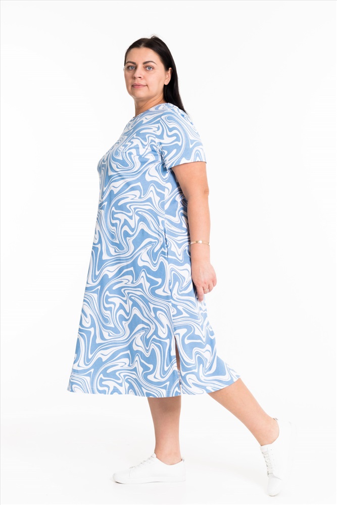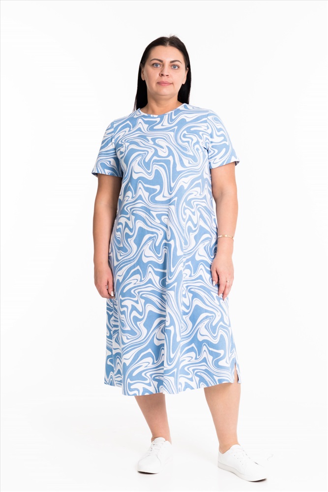 Тип длинны (для платьев): Миди Вид ткани: Кулирка Сезон: Летний Состав: Хлопок 100% Цвет Номенклатуры: серо-голубой Женское платье свободного силуэта выполнено из х/б полотна. По бокам декоративные разрезы, горловина оформлена бейкой. В боковых швах размещены карманы. Комментарии к товару