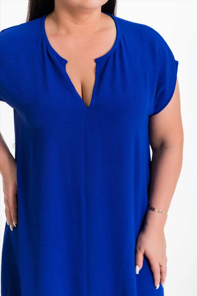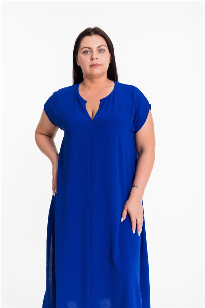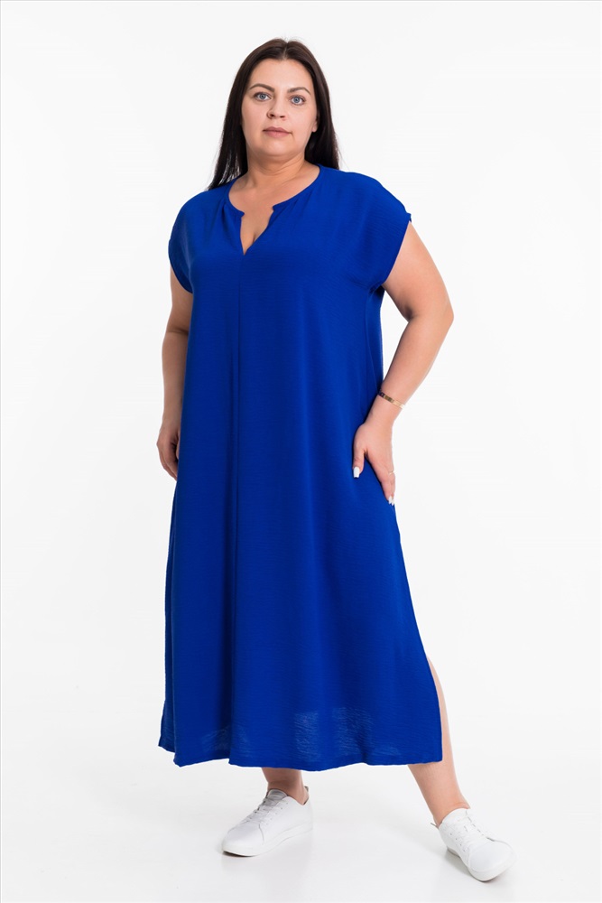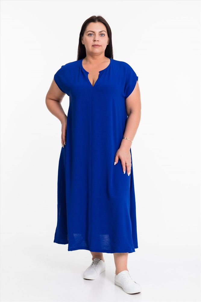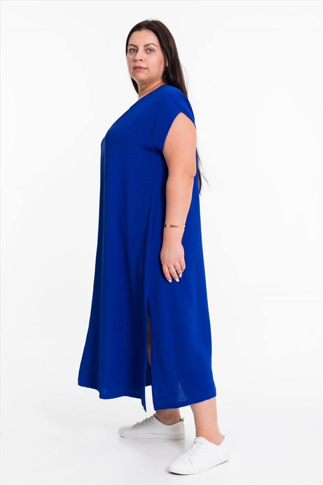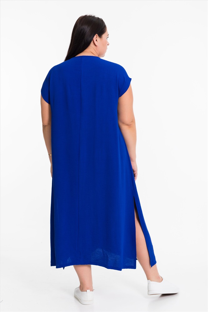 Тип длинны (для платьев): Миди Вид ткани: Манго Сезон: Летний Состав: Полиэстер 100% Цвет Номенклатуры: васильковый Платье выполнено из полотна "манго". Платье свободного силуэта, удлинённое, со спущенной линией плеча и декоративными разрезами по бокам снизу. Комментарии к товару