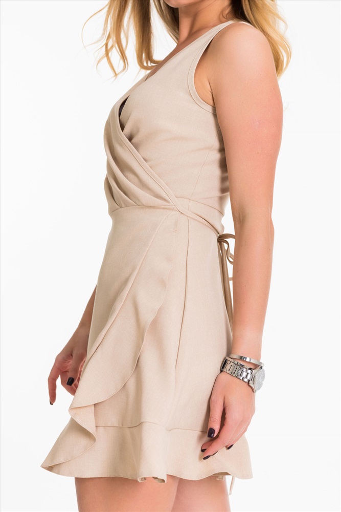 Тип длинны (для платьев): Мини Вид ткани: Лен натуральный с вискозой Сезон: Летний Состав: Вискоза 80% Лён 18% Спандекс 2% Цвет Номенклатуры: бежевый Платье летнее на запах выполнено из натурального льна с вискозой. Платье без рукавов, юбка декорирована оборками. Комментарии к товару